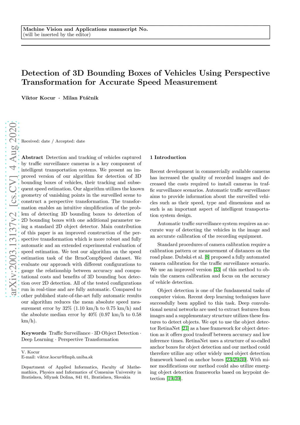 Detection and tracking of vehicles captured by traffic surveillance cameras is a key component of intelligent transportation systems. We present an improved version of our algorithm for detection of 3D bounding boxes of vehicles, their tracking and subsequent speed estimation. Our algorithm utilizes the known geometry of vanishing points in the surveilled scene to construct a perspective transformation. The transformation enables an intuitive simplification of the problem of detecting 3D bounding boxes to detection of 2D bounding boxes with one additional parameter using a standard 2D object detector. Main contribution of this paper is an improved construction of the perspective transformation which is more robust and fully automatic and an extended experimental evaluation of speed estimation. We test our algorithm on the speed estimation task of the BrnoCompSpeed dataset. We evaluate our approach with different configurations to gauge the relationship between accuracy and computational costs and benefits of 3D bounding box detection over 2D detection. All of the tested configurations run in real-time and are fully automatic. Compared to other published state-of-the-art fully automatic results our algorithm reduces the mean absolute speed measurement error by 32% (1.10 km/h to 0.75 km/h) and the absolute median error by 40% (0.97 km/h to 0.58 km/h).
