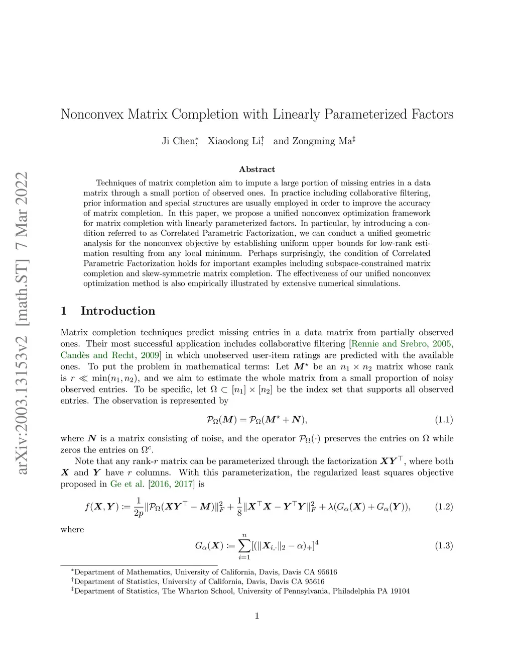 Techniques of matrix completion aim to impute a large portion of missing entries in a data matrix through a small portion of observed ones. In practice including collaborative filtering, prior information and special structures are usually employed in order to improve the accuracy of matrix completion. In this paper, we propose a unified nonconvex optimization framework for matrix completion with linearly parameterized factors. In particular, by introducing a condition referred to as Correlated Parametric Factorization, we can conduct a unified geometric analysis for the nonconvex objective by establishing uniform upper bounds for low-rank estimation resulting from any local minimum. Perhaps surprisingly, the condition of Correlated Parametric Factorization holds for important examples including subspace-constrained matrix completion and skew-symmetric matrix completion. The effectiveness of our unified nonconvex optimization method is also empirically illustrated by extensive numerical simulations.