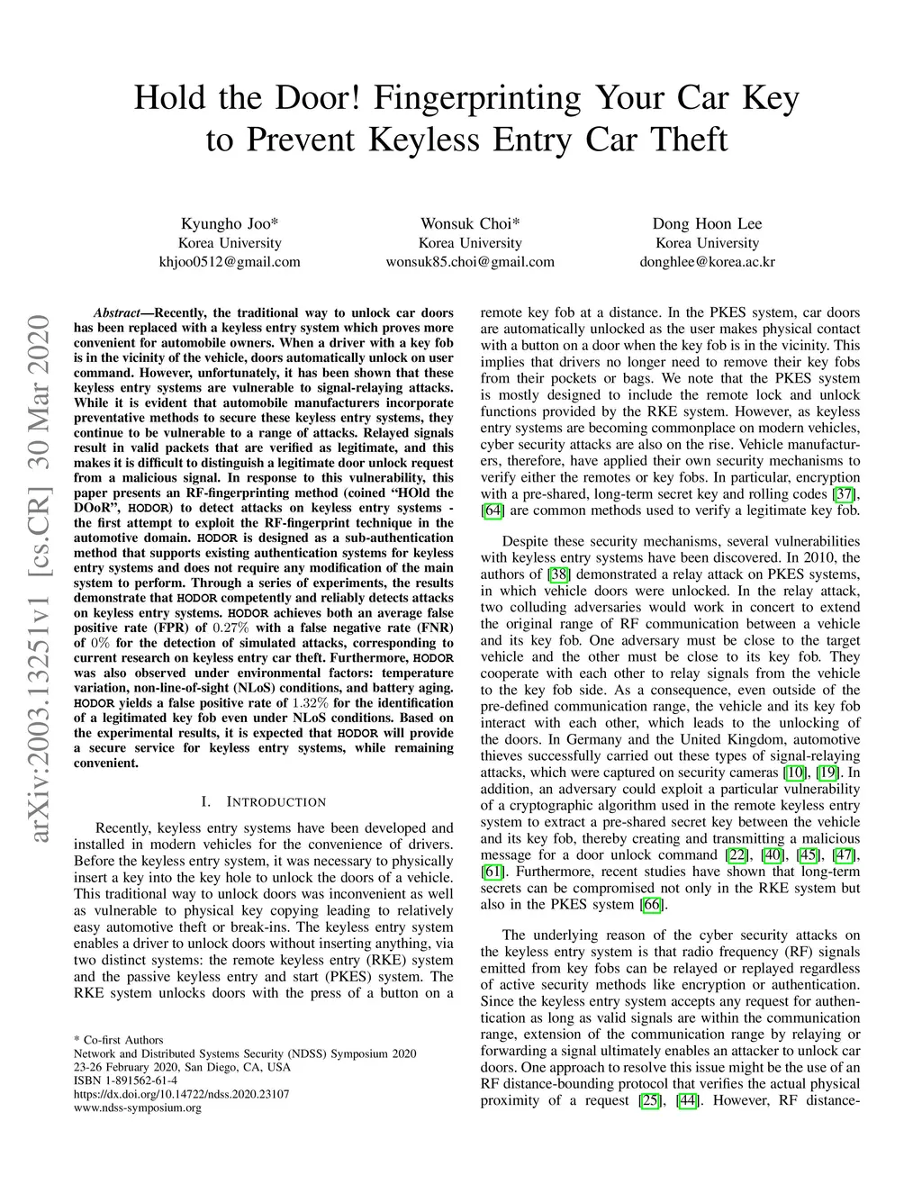 Hold the Door! Fingerprinting Your Car Key to Prevent Keyless Entry Car