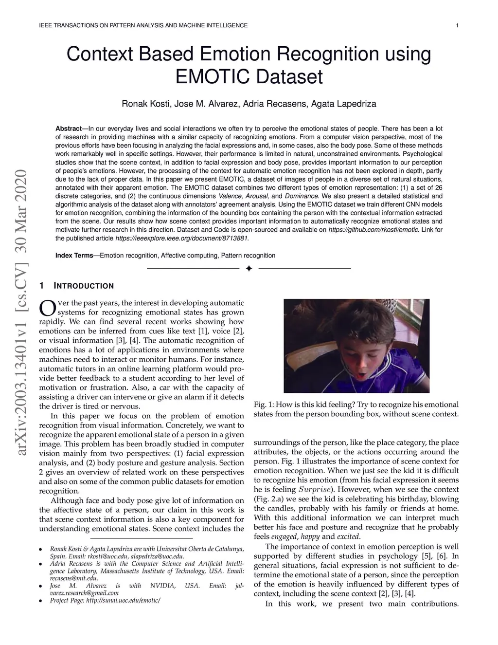 In our everyday lives and social interactions we often try to perceive the emotional states of people. There has been a lot of research in providing machines with a similar capacity of recognizing emotions. From a computer vision perspective, most of the previous efforts have been focusing in analyzing the facial expressions and, in some cases, also the body pose. Some of these methods work remarkably well in specific settings. However, their performance is limited in natural, unconstrained environments. Psychological studies show that the scene context, in addition to facial expression and body pose, provides important information to our perception of people's emotions. However, the processing of the context for automatic emotion recognition has not been explored in depth, partly due to the lack of proper data. In this paper we present EMOTIC, a dataset of images of people in a diverse set of natural situations, annotated with their apparent emotion. The EMOTIC dataset combines two different types of emotion representation: (1) a set of 26 discrete categories, and (2) the continuous dimensions Valence, Arousal, and Dominance. We also present a detailed statistical and algorithmic analysis of the dataset along with annotators' agreement analysis. Using the EMOTIC dataset we train different CNN models for emotion recognition, combining the information of the bounding box containing the person with the contextual information extracted from the scene. Our results show how scene context provides important information to automatically recognize emotional states and motivate further research in this direction. Dataset and code is open-sourced and available at: https://github.com/rkosti/emotic and link for the peer-reviewed published article: https://ieeexplore.ieee.org/document/8713881