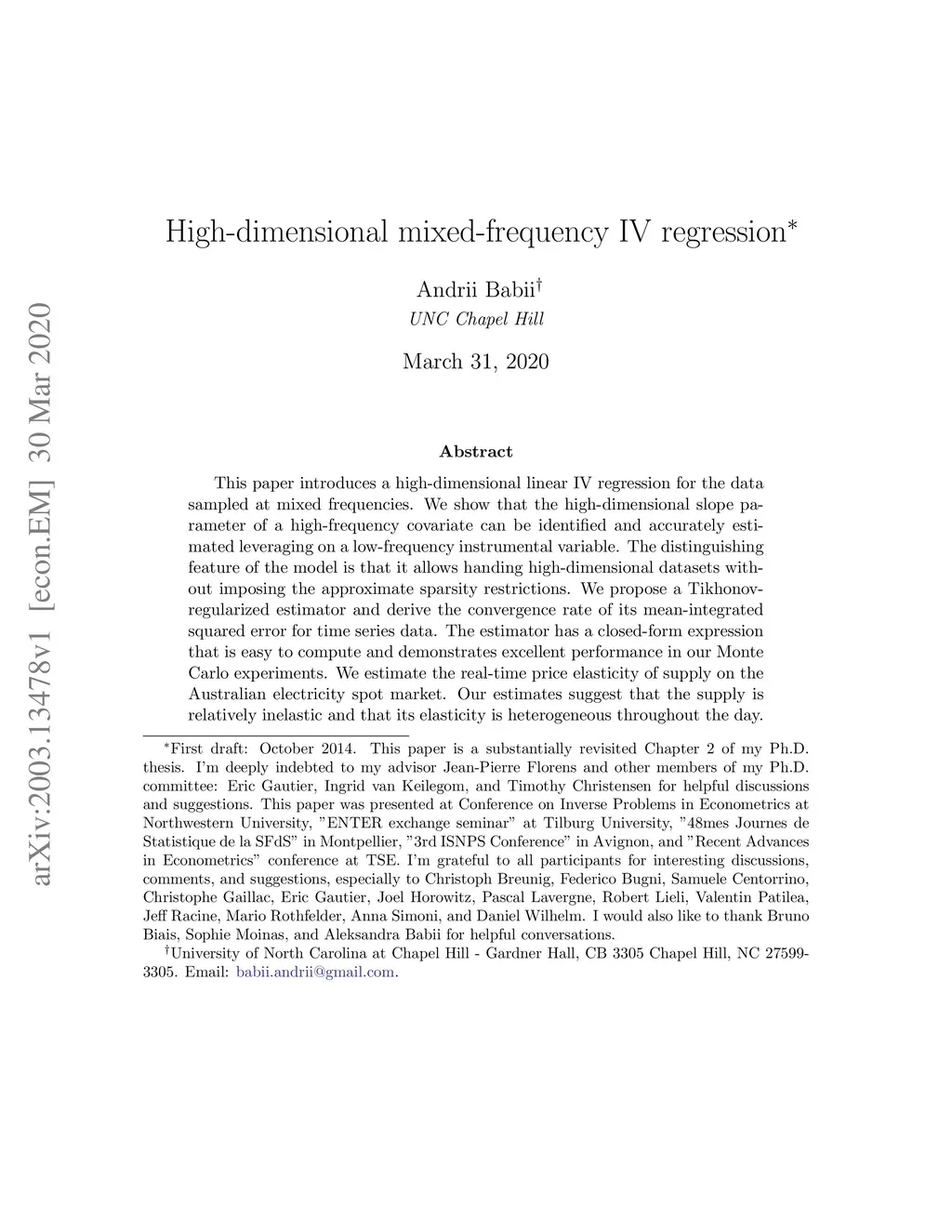 This paper introduces a high-dimensional linear IV regression for the data sampled at mixed frequencies. We show that the high-dimensional slope parameter of a high-frequency covariate can be identified and accurately estimated leveraging on a low-frequency instrumental variable. The distinguishing feature of the model is that it allows handing high-dimensional datasets without imposing the approximate sparsity restrictions. We propose a Tikhonov-regularized estimator and derive the convergence rate of its mean-integrated squared error for time series data. The estimator has a closed-form expression that is easy to compute and demonstrates excellent performance in our Monte Carlo experiments. We estimate the real-time price elasticity of supply on the Australian electricity spot market. Our estimates suggest that the supply is relatively inelastic and that its elasticity is heterogeneous throughout the day.