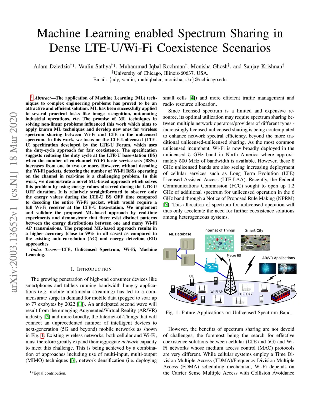 The application of Machine Learning (ML) techniques to complex engineering problems has proved to be an attractive and efficient solution. ML has been successfully applied to several practical tasks like image recognition, automating industrial operations, etc. The promise of ML techniques in solving non-linear problems influenced this work which aims to apply known ML techniques and develop new ones for wireless spectrum sharing between Wi-Fi and LTE in the unlicensed spectrum. In this work, we focus on the LTE-Unlicensed (LTE-U) specification developed by the LTE-U Forum, which uses the duty-cycle approach for fair coexistence. The specification suggests reducing the duty cycle at the LTE-U base-station (BS) when the number of co-channel Wi-Fi basic service sets (BSSs) increases from one to two or more. However, without decoding the Wi-Fi packets, detecting the number of Wi-Fi BSSs operating on the channel in real-time is a challenging problem. In this work, we demonstrate a novel ML-based approach which solves this problem by using energy values observed during the LTE-U OFF duration. It is relatively straightforward to observe only the energy values during the LTE-U BS OFF time compared to decoding the entire Wi-Fi packet, which would require a full Wi-Fi receiver at the LTE-U base-station. We implement and validate the proposed ML-based approach by real-time experiments and demonstrate that there exist distinct patterns between the energy distributions between one and many Wi-Fi AP transmissions. The proposed ML-based approach results in a higher accuracy (close to 99\% in all cases) as compared to the existing auto-correlation (AC) and energy detection (ED) approaches.