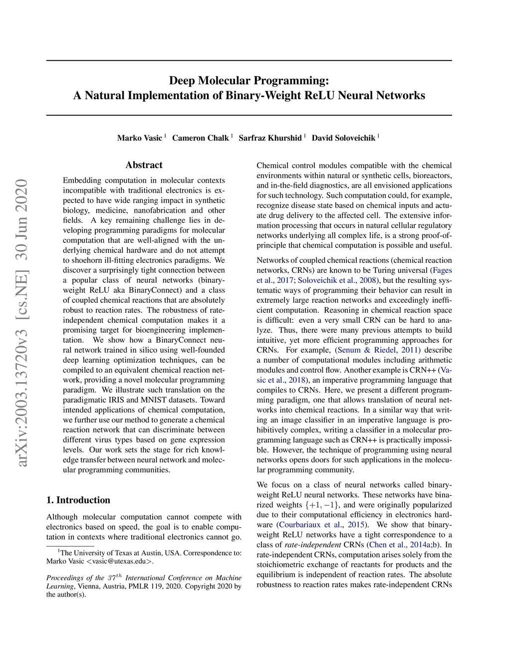 Embedding computation in molecular contexts incompatible with traditional electronics is expected to have wide ranging impact in synthetic biology, medicine, nanofabrication and other fields. A key remaining challenge lies in developing programming paradigms for molecular computation that are well-aligned with the underlying chemical hardware and do not attempt to shoehorn ill-fitting electronics paradigms. We discover a surprisingly tight connection between a popular class of neural networks (binary-weight ReLU aka BinaryConnect) and a class of coupled chemical reactions that are absolutely robust to reaction rates. The robustness of rate-independent chemical computation makes it a promising target for bioengineering implementation. We show how a BinaryConnect neural network trained in silico using well-founded deep learning optimization techniques, can be compiled to an equivalent chemical reaction network, providing a novel molecular programming paradigm. We illustrate such translation on the paradigmatic IRIS and MNIST datasets. Toward intended applications of chemical computation, we further use our method to generate a chemical reaction network that can discriminate between different virus types based on gene expression levels. Our work sets the stage for rich knowledge transfer between neural network and molecular programming communities.