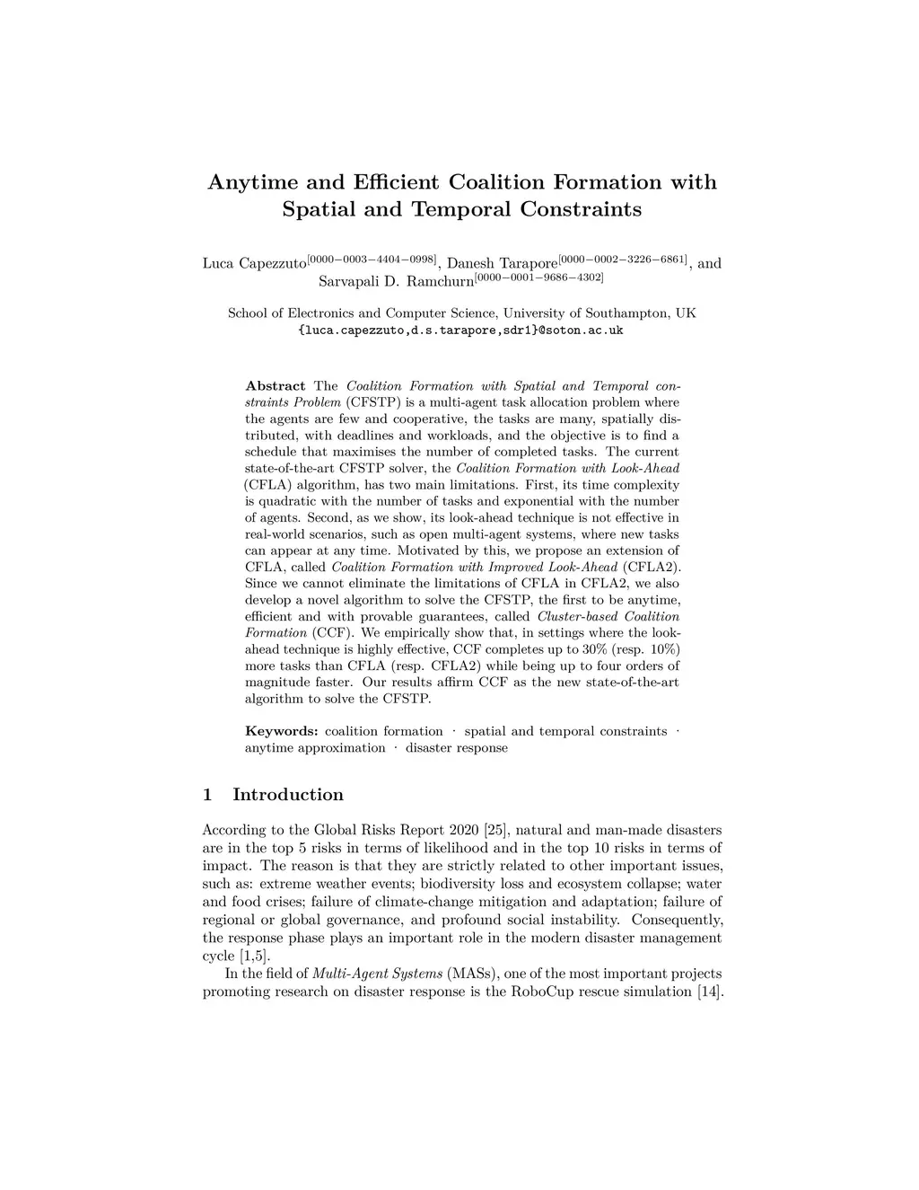 The Coalition Formation with Spatial and Temporal constraints Problem (CFSTP) is a multi-agent task allocation problem where the agents are cooperative and few, the tasks are many, spatially distributed, with deadlines and workloads, and the objective is to find a schedule that maximises the number of completed tasks. The current state-of-the-art CFSTP solver, the Coalition Formation with Look-Ahead (CFLA) algorithm, has two main limitations. First, its time complexity is quadratic with the number of tasks and exponential with the number of agents, which makes it not efficient. Second, its look-ahead technique is not effective in real-world scenarios, such as open multi-agent systems, where new tasks can appear at any time. Motivated by this, we propose an extension of CFLA, which we call Coalition Formation with Improved Look-Ahead (CFLA+). Since CFLA+ inherits the limitations of CFLA, we also develop a novel algorithm to solve the CFSTP, the first to be both anytime and efficient, which we call Clustered-based Coalition Formation (CCF). We empirically show that, in settings where the look-ahead technique is highly effective, CCF completes up to 20% (resp. 10%) more tasks than CFLA (resp. CFLA+) while being up to four orders of magnitude faster. Our results affirm CCF as the new state-of-the-art CFSTP solver.