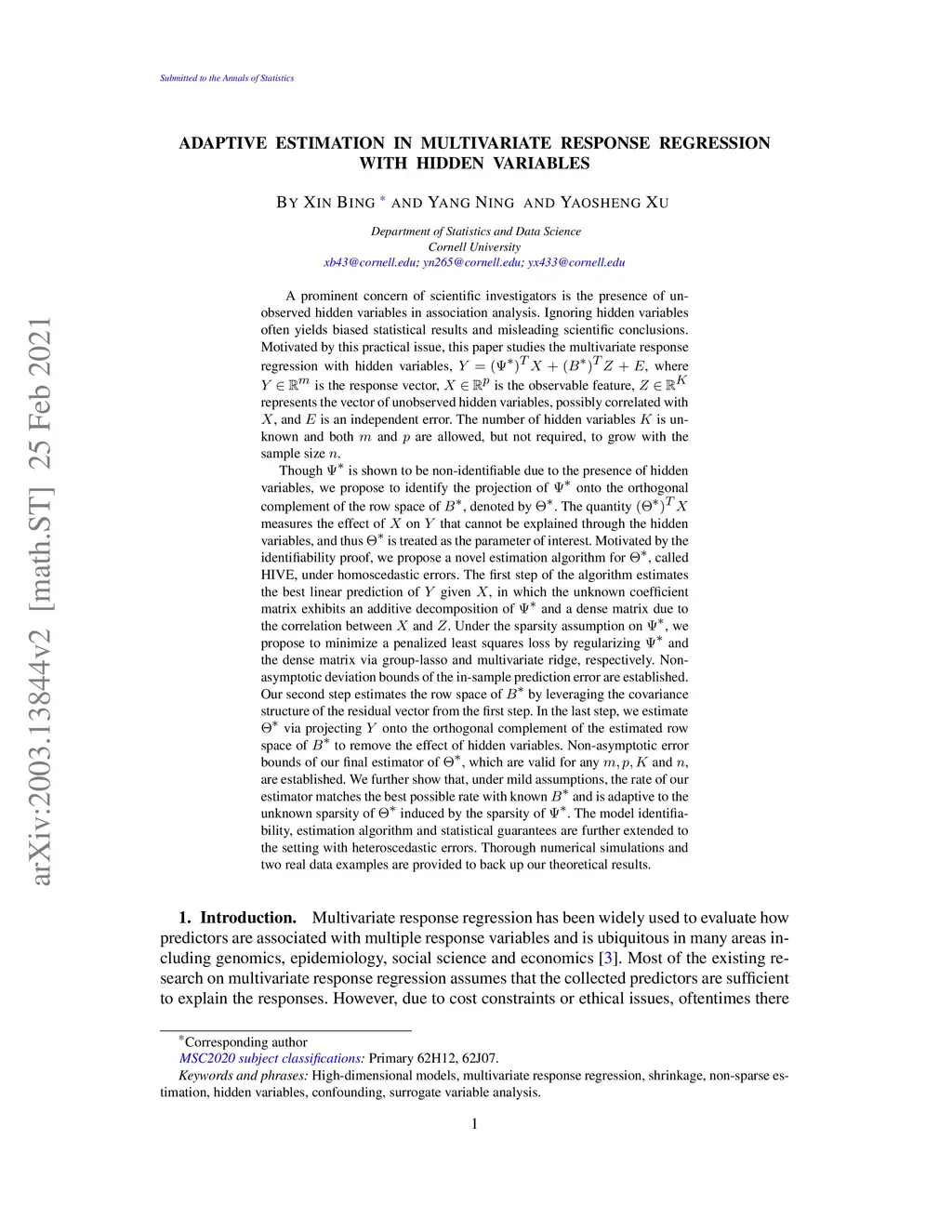 This paper studies the estimation of the coefficient matrix in multivariate regression with hidden variables, , where is a -dimensional response vector, is a -dimensional vector of observable features, represents a -dimensional vector of unobserved hidden variables, possibly correlated with , and is an independent error. The number of hidden variables is unknown and both and are allowed but not required to grow with the sample size . Since only and are observable, we provide necessary conditions for the identifiability of . The same set of conditions are shown to be sufficient when the error is homoscedastic. Our identifiability proof is constructive and leads to a novel and computationally efficient estimation algorithm, called HIVE. The first step of the algorithm is to estimate the best linear prediction of given in which the unknown coefficient matrix exhibits an additive decomposition of and a dense matrix originated from the correlation between and the hidden variable . Under the row sparsity assumption on , we propose to minimize a penalized least squares loss by regularizing via a group-lasso penalty and regularizing the dense matrix via a multivariate ridge penalty. Non-asymptotic deviation bounds of the in-sample prediction error are established. Our second step is to estimate the row space of by leveraging the covariance structure of the residual vector from the first step. In the last step, we remove the effect of hidden variable by projecting onto the complement of the estimated row space of . Non-asymptotic error bounds of our final estimator are established. The model identifiability, parameter estimation and statistical guarantees are further extended to the setting with heteroscedastic errors.