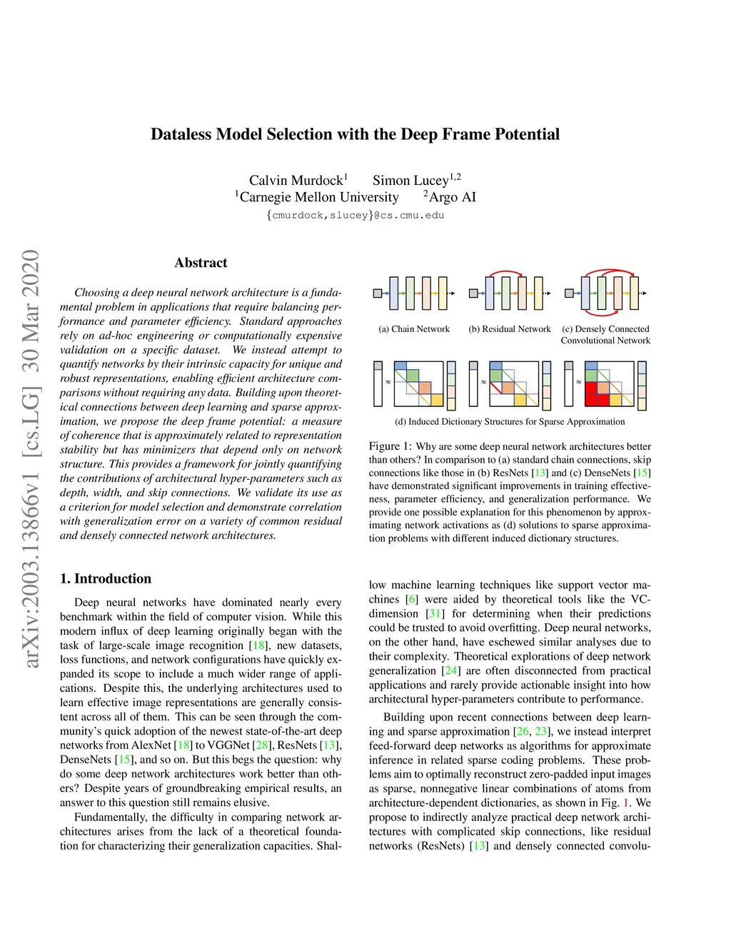 Choosing a deep neural network architecture is a fundamental problem in applications that require balancing performance and parameter efficiency. Standard approaches rely on ad-hoc engineering or computationally expensive validation on a specific dataset. We instead attempt to quantify networks by their intrinsic capacity for unique and robust representations, enabling efficient architecture comparisons without requiring any data. Building upon theoretical connections between deep learning and sparse approximation, we propose the deep frame potential: a measure of coherence that is approximately related to representation stability but has minimizers that depend only on network structure. This provides a framework for jointly quantifying the contributions of architectural hyper-parameters such as depth, width, and skip connections. We validate its use as a criterion for model selection and demonstrate correlation with generalization error on a variety of common residual and densely connected network architectures.