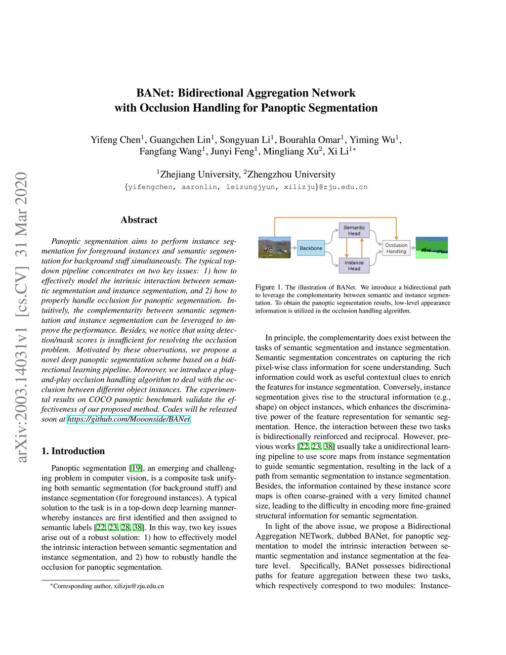 Panoptic segmentation aims to perform instance segmentation for foreground instances and semantic segmentation for background stuff simultaneously. The typical top-down pipeline concentrates on two key issues: 1) how to effectively model the intrinsic interaction between semantic segmentation and instance segmentation, and 2) how to properly handle occlusion for panoptic segmentation. Intuitively, the complementarity between semantic segmentation and instance segmentation can be leveraged to improve the performance. Besides, we notice that using detection/mask scores is insufficient for resolving the occlusion problem. Motivated by these observations, we propose a novel deep panoptic segmentation scheme based on a bidirectional learning pipeline. Moreover, we introduce a plug-and-play occlusion handling algorithm to deal with the occlusion between different object instances. The experimental results on COCO panoptic benchmark validate the effectiveness of our proposed method. Codes will be released soon at https://github.com/Mooonside/BANet.