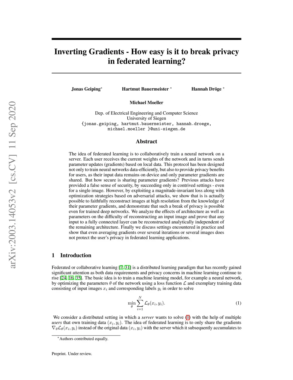 Inverting Gradients -- How easy is it to break privacy in federated