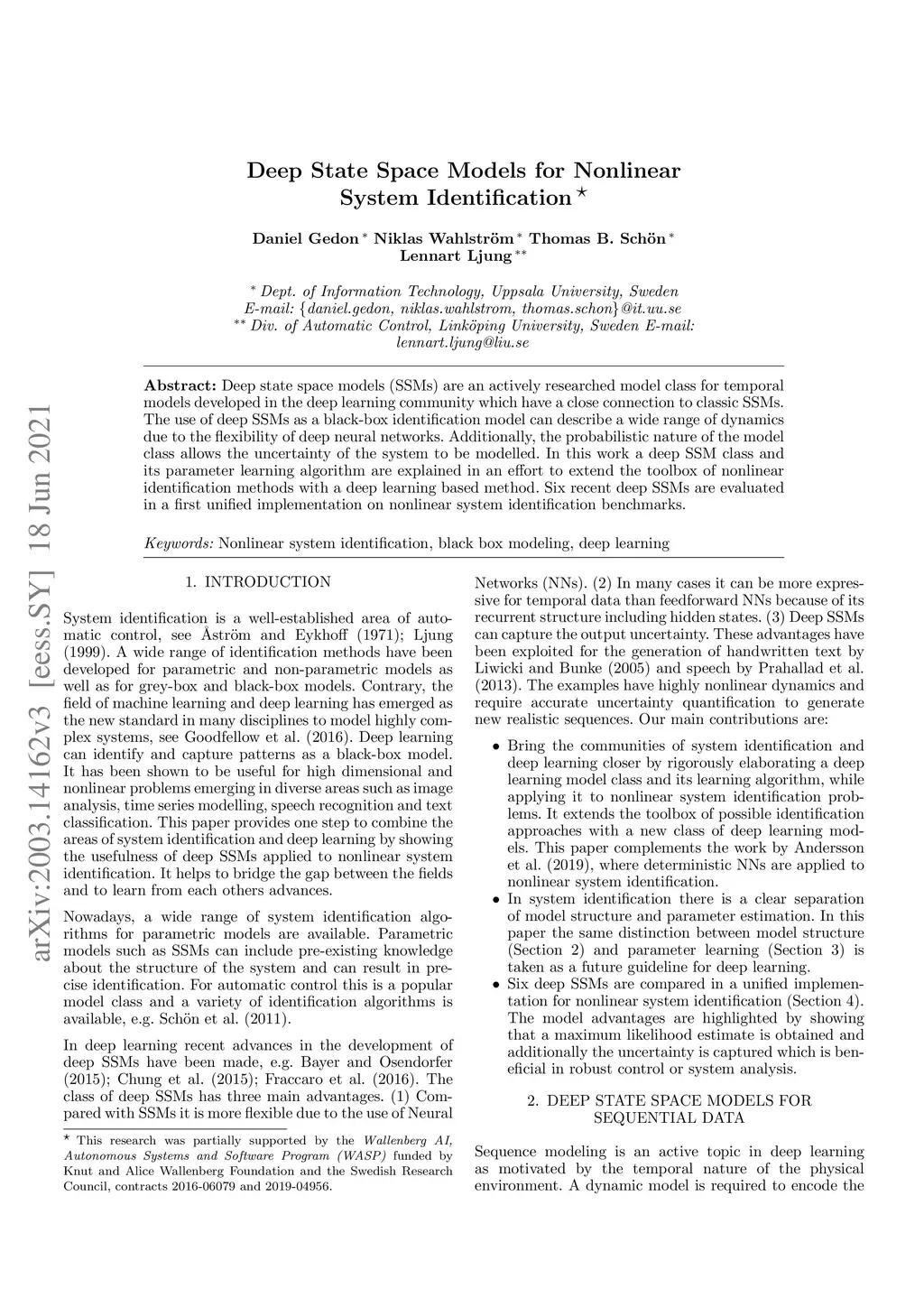 Deep state space models (SSMs) are an actively researched model class for temporal models developed in the deep learning community which have a close connection to classic SSMs. The use of deep SSMs as a black-box identification model can describe a wide range of dynamics due to the flexibility of deep neural networks. Additionally, the probabilistic nature of the model class allows the uncertainty of the system to be modelled. In this work a deep SSM class and its parameter learning algorithm are explained in an effort to extend the toolbox of nonlinear identification methods with a deep learning based method. Six recent deep SSMs are evaluated in a first unified implementation on nonlinear system identification benchmarks.
