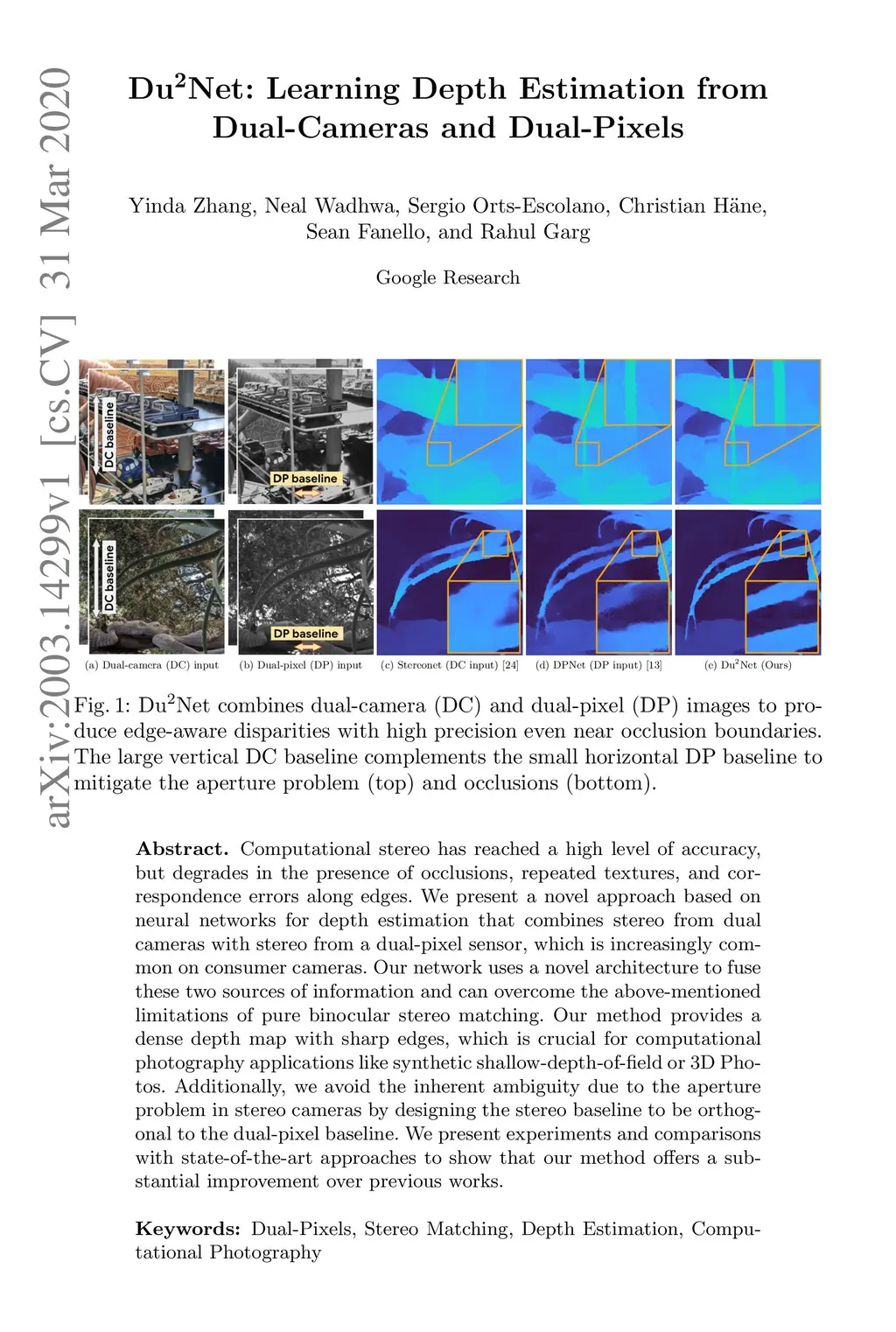 Computational stereo has reached a high level of accuracy, but degrades in the presence of occlusions, repeated textures, and correspondence errors along edges. We present a novel approach based on neural networks for depth estimation that combines stereo from dual cameras with stereo from a dual-pixel sensor, which is increasingly common on consumer cameras. Our network uses a novel architecture to fuse these two sources of information and can overcome the above-mentioned limitations of pure binocular stereo matching. Our method provides a dense depth map with sharp edges, which is crucial for computational photography applications like synthetic shallow-depth-of-field or 3D Photos. Additionally, we avoid the inherent ambiguity due to the aperture problem in stereo cameras by designing the stereo baseline to be orthogonal to the dual-pixel baseline. We present experiments and comparisons with state-of-the-art approaches to show that our method offers a substantial improvement over previous works.