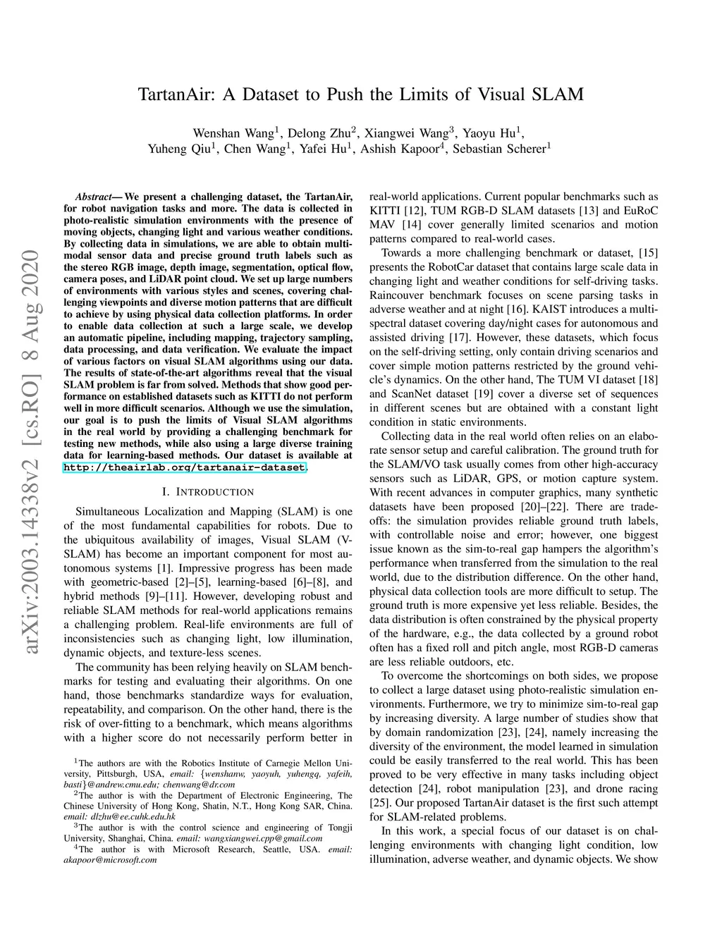 We present a challenging dataset, the TartanAir, for robot navigation tasks and more. The data is collected in photo-realistic simulation environments with the presence of moving objects, changing light and various weather conditions. By collecting data in simulations, we are able to obtain multi-modal sensor data and precise ground truth labels such as the stereo RGB image, depth image, segmentation, optical flow, camera poses, and LiDAR point cloud. We set up large numbers of environments with various styles and scenes, covering challenging viewpoints and diverse motion patterns that are difficult to achieve by using physical data collection platforms. In order to enable data collection at such a large scale, we develop an automatic pipeline, including mapping, trajectory sampling, data processing, and data verification. We evaluate the impact of various factors on visual SLAM algorithms using our data. The results of state-of-the-art algorithms reveal that the visual SLAM problem is far from solved. Methods that show good performance on established datasets such as KITTI do not perform well in more difficult scenarios. Although we use the simulation, our goal is to push the limits of Visual SLAM algorithms in the real world by providing a challenging benchmark for testing new methods, while also using a large diverse training data for learning-based methods. Our dataset is available at \url{http://theairlab.org/tartanair-dataset}.