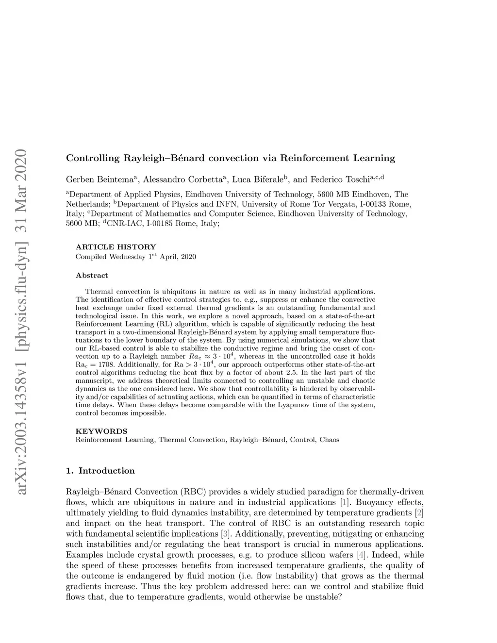 Thermal convection is ubiquitous in nature as well as in many industrial applications. The identification of effective control strategies to, e.g., suppress or enhance the convective heat exchange under fixed external thermal gradients is an outstanding fundamental and technological issue. In this work, we explore a novel approach, based on a state-of-the-art Reinforcement Learning (RL) algorithm, which is capable of significantly reducing the heat transport in a two-dimensional Rayleigh-B\énard system by applying small temperature fluctuations to the lower boundary of the system. By using numerical simulations, we show that our RL-based control is able to stabilize the conductive regime and bring the onset of convection up to a Rayleigh number , whereas in the uncontrolled case it holds . Additionally, for , our approach outperforms other state-of-the-art control algorithms reducing the heat flux by a factor of about . In the last part of the manuscript, we address theoretical limits connected to controlling an unstable and chaotic dynamics as the one considered here. We show that controllability is hindered by observability and/or capabilities of actuating actions, which can be quantified in terms of characteristic time delays. When these delays become comparable with the Lyapunov time of the system, control becomes impossible.