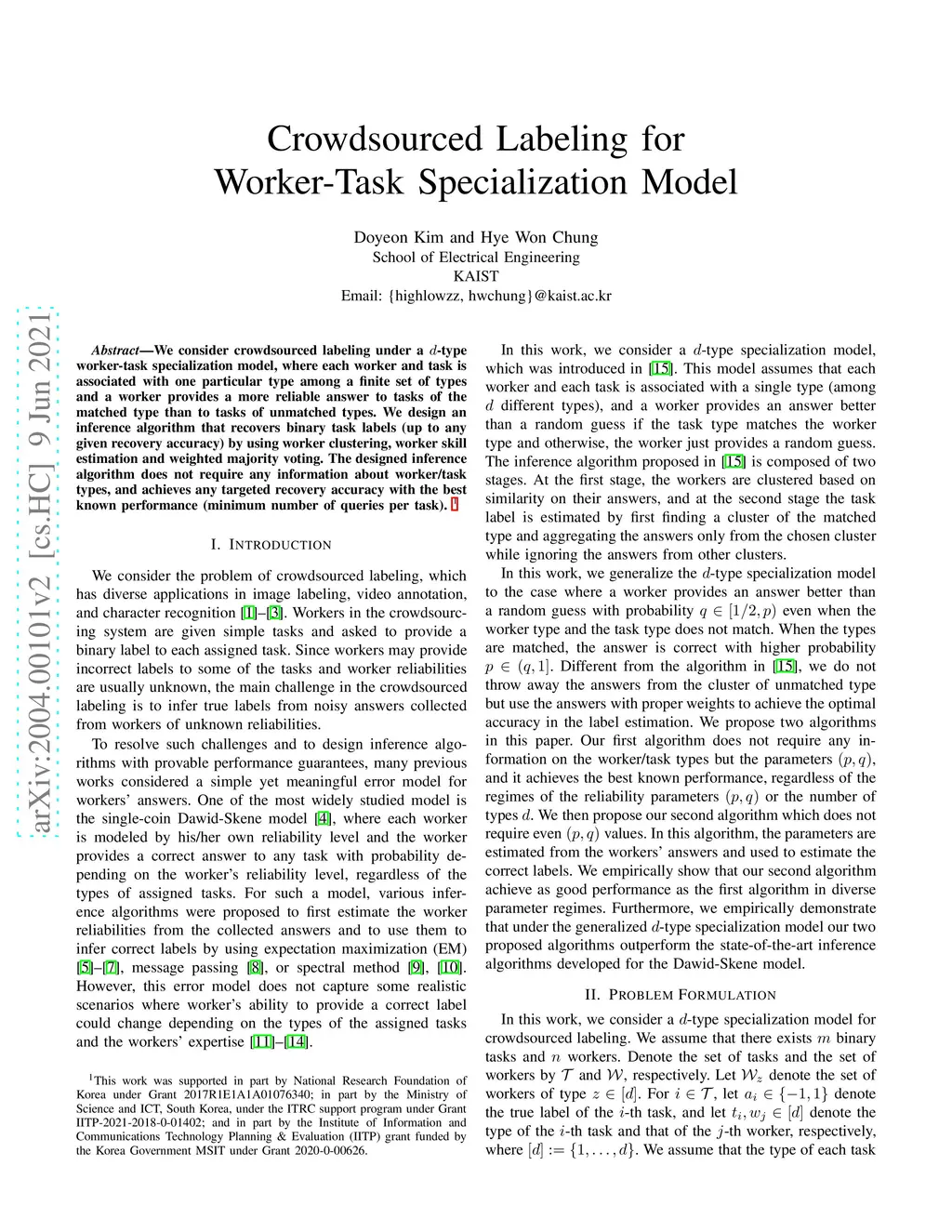 We consider crowdsourced labeling under a -type worker-task specialization model, where each worker and task is associated with one particular type among a finite set of types and a worker provides a more reliable answer to tasks of the matched type than to tasks of unmatched types. We design an inference algorithm that recovers binary task labels (up to any given recovery accuracy) by using worker clustering, worker skill estimation and weighted majority voting. The designed inference algorithm does not require any information about worker/task types, and achieves any targeted recovery accuracy with the best known performance (minimum number of queries per task).