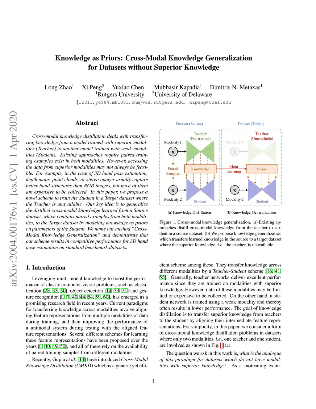 Cross-modal knowledge distillation deals with transferring knowledge from a model trained with superior modalities (Teacher) to another model trained with weak modalities (Student). Existing approaches require paired training examples exist in both modalities. However, accessing the data from superior modalities may not always be feasible. For example, in the case of 3D hand pose estimation, depth maps, point clouds, or stereo images usually capture better hand structures than RGB images, but most of them are expensive to be collected. In this paper, we propose a novel scheme to train the Student in a Target dataset where the Teacher is unavailable. Our key idea is to generalize the distilled cross-modal knowledge learned from a Source dataset, which contains paired examples from both modalities, to the Target dataset by modeling knowledge as priors on parameters of the Student. We name our method "Cross-Modal Knowledge Generalization" and demonstrate that our scheme results in competitive performance for 3D hand pose estimation on standard benchmark datasets.