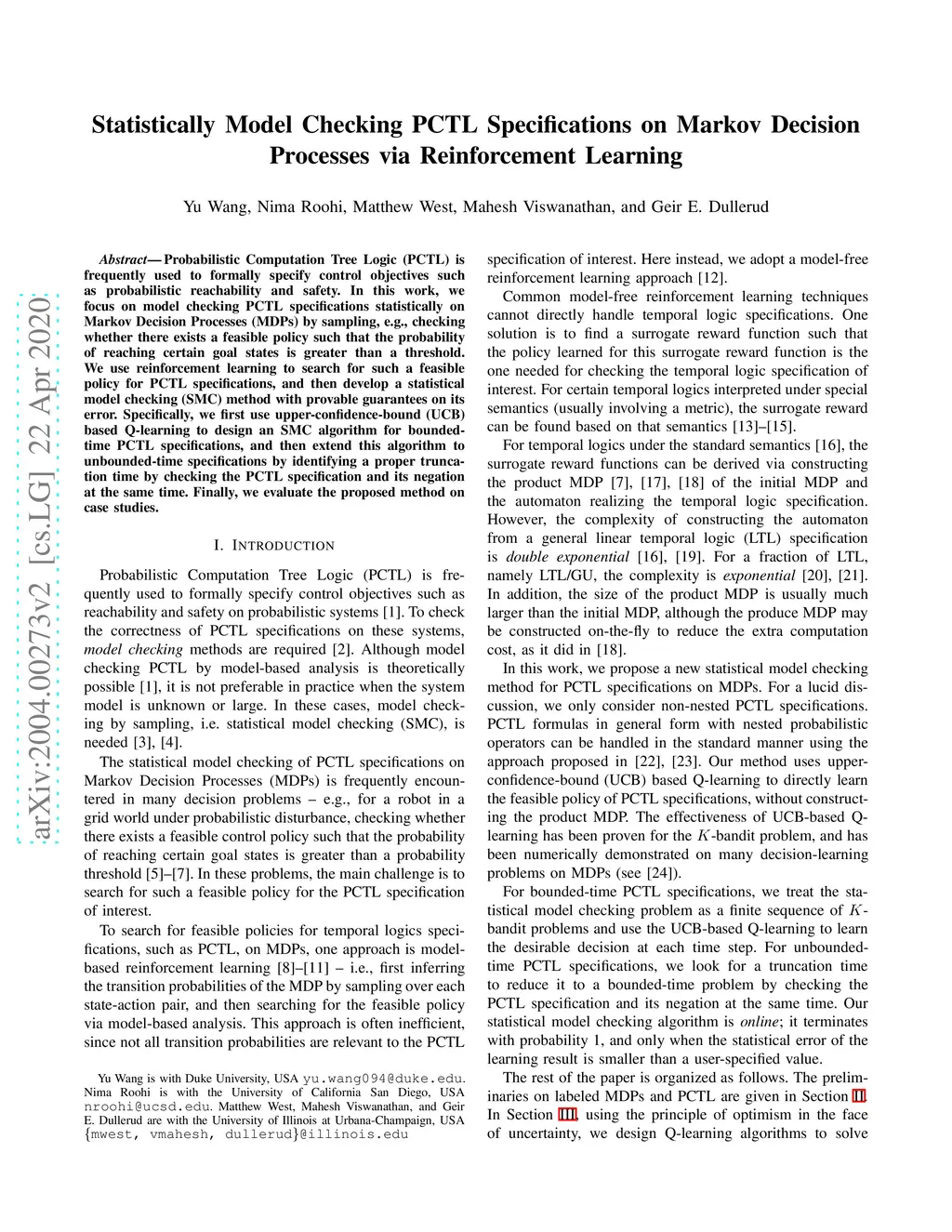 Probabilistic Computation Tree Logic (PCTL) is frequently used to formally specify control objectives such as probabilistic reachability and safety. In this work, we focus on model checking PCTL specifications statistically on Markov Decision Processes (MDPs) by sampling, e.g., checking whether there exists a feasible policy such that the probability of reaching certain goal states is greater than a threshold. We use reinforcement learning to search for such a feasible policy for PCTL specifications, and then develop a statistical model checking (SMC) method with provable guarantees on its error. Specifically, we first use upper-confidence-bound (UCB) based Q-learning to design an SMC algorithm for bounded-time PCTL specifications, and then extend this algorithm to unbounded-time specifications by identifying a proper truncation time by checking the PCTL specification and its negation at the same time. Finally, we evaluate the proposed method on case studies.