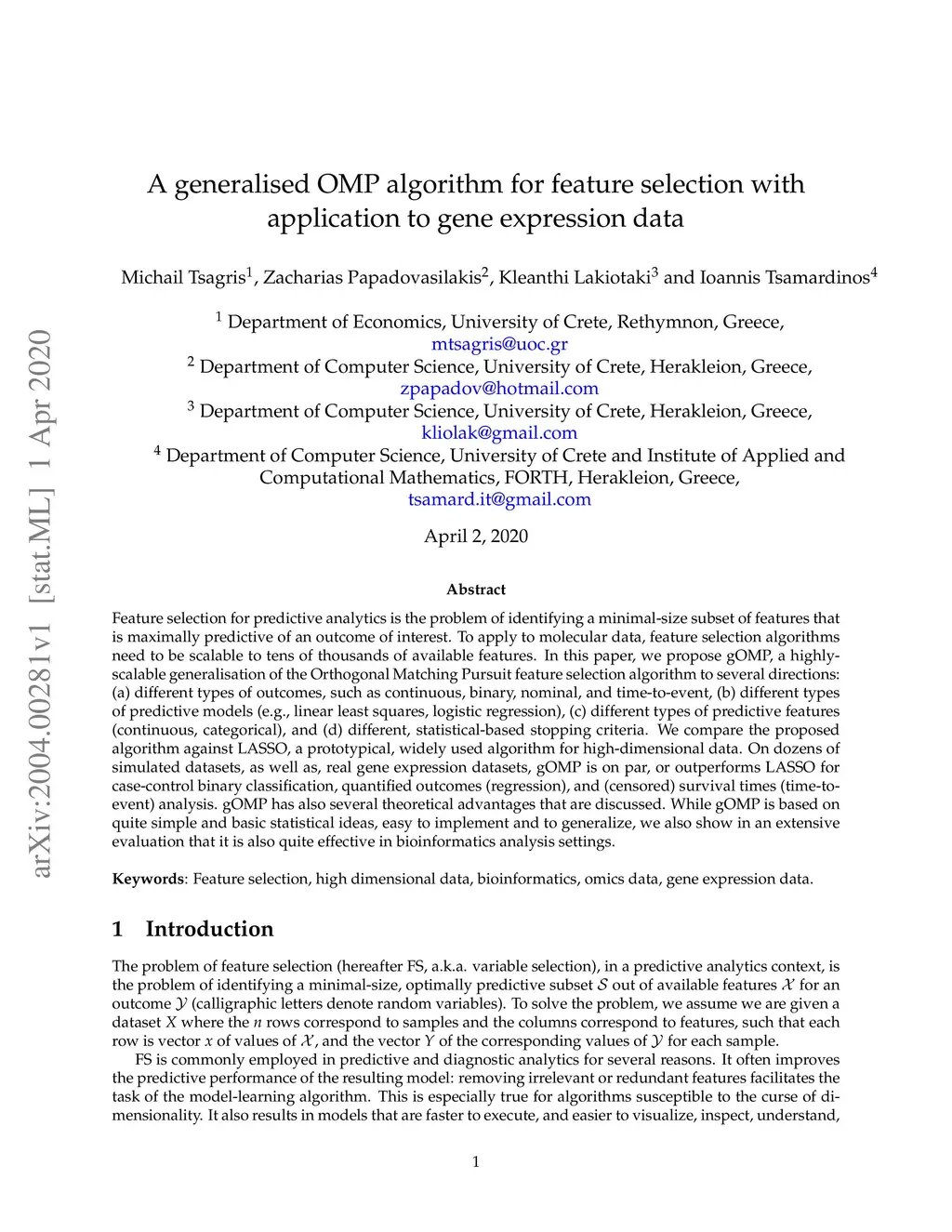 Feature selection for predictive analytics is the problem of identifying a minimal-size subset of features that is maximally predictive of an outcome of interest. To apply to molecular data, feature selection algorithms need to be scalable to tens of thousands of available features. In this paper, we propose gOMP, a highly-scalable generalisation of the Orthogonal Matching Pursuit feature selection algorithm to several directions: (a) different types of outcomes, such as continuous, binary, nominal, and time-to-event, (b) different types of predictive models (e.g., linear least squares, logistic regression), (c) different types of predictive features (continuous, categorical), and (d) different, statistical-based stopping criteria. We compare the proposed algorithm against LASSO, a prototypical, widely used algorithm for high-dimensional data. On dozens of simulated datasets, as well as, real gene expression datasets, gOMP is on par, or outperforms LASSO for case-control binary classification, quantified outcomes (regression), and (censored) survival times (time-to-event) analysis. gOMP has also several theoretical advantages that are discussed. While gOMP is based on quite simple and basic statistical ideas, easy to implement and to generalize, we also show in an extensive evaluation that it is also quite effective in bioinformatics analysis settings.