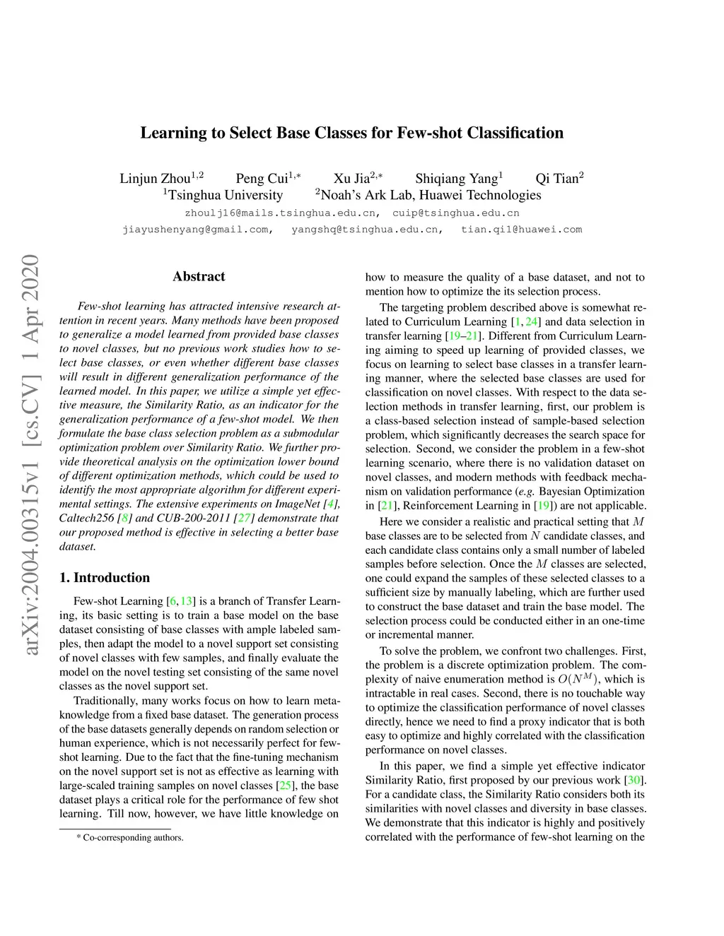 Few-shot learning has attracted intensive research attention in recent years. Many methods have been proposed to generalize a model learned from provided base classes to novel classes, but no previous work studies how to select base classes, or even whether different base classes will result in different generalization performance of the learned model. In this paper, we utilize a simple yet effective measure, the Similarity Ratio, as an indicator for the generalization performance of a few-shot model. We then formulate the base class selection problem as a submodular optimization problem over Similarity Ratio. We further provide theoretical analysis on the optimization lower bound of different optimization methods, which could be used to identify the most appropriate algorithm for different experimental settings. The extensive experiments on ImageNet, Caltech256 and CUB-200-2011 demonstrate that our proposed method is effective in selecting a better base dataset.