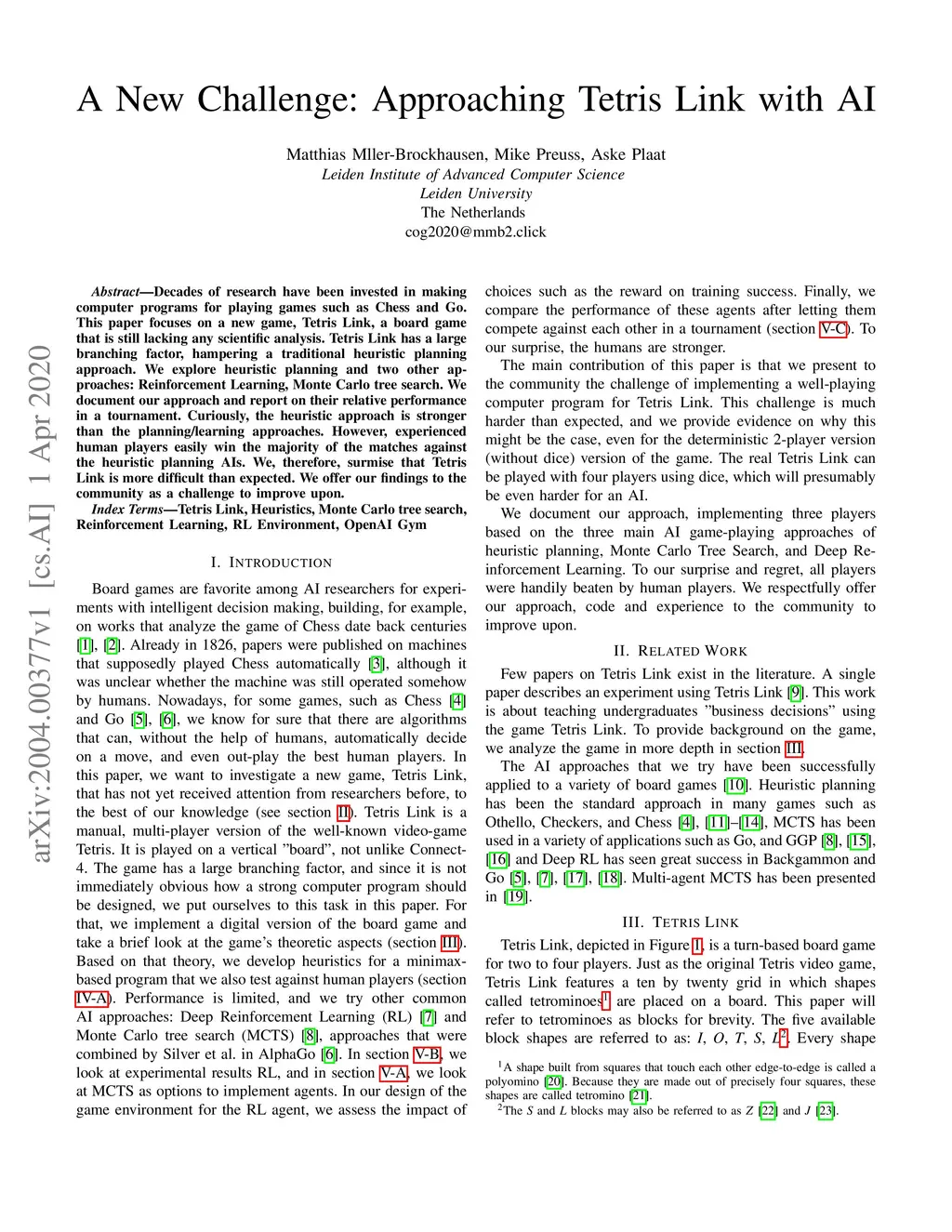 Decades of research have been invested in making computer programs for playing games such as Chess and Go. This paper focuses on a new game, Tetris Link, a board game that is still lacking any scientific analysis. Tetris Link has a large branching factor, hampering a traditional heuristic planning approach. We explore heuristic planning and two other approaches: Reinforcement Learning, Monte Carlo tree search. We document our approach and report on their relative performance in a tournament. Curiously, the heuristic approach is stronger than the planning/learning approaches. However, experienced human players easily win the majority of the matches against the heuristic planning AIs. We, therefore, surmise that Tetris Link is more difficult than expected. We offer our findings to the community as a challenge to improve upon.