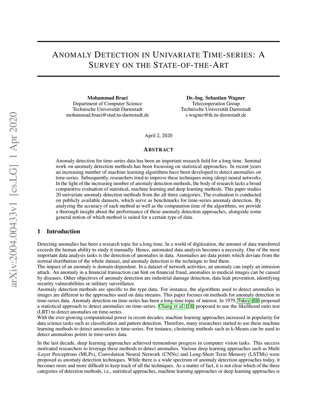 Anomaly detection for time-series data has been an important research field for a long time. Seminal work on anomaly detection methods has been focussing on statistical approaches. In recent years an increasing number of machine learning algorithms have been developed to detect anomalies on time-series. Subsequently, researchers tried to improve these techniques using (deep) neural networks. In the light of the increasing number of anomaly detection methods, the body of research lacks a broad comparative evaluation of statistical, machine learning and deep learning methods. This paper studies 20 univariate anomaly detection methods from the all three categories. The evaluation is conducted on publicly available datasets, which serve as benchmarks for time-series anomaly detection. By analyzing the accuracy of each method as well as the computation time of the algorithms, we provide a thorough insight about the performance of these anomaly detection approaches, alongside some general notion of which method is suited for a certain type of data.