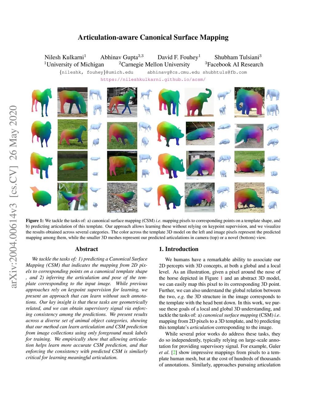 We tackle the tasks of: 1) predicting a Canonical Surface Mapping (CSM) that indicates the mapping from 2D pixels to corresponding points on a canonical template shape, and 2) inferring the articulation and pose of the template corresponding to the input image. While previous approaches rely on keypoint supervision for learning, we present an approach that can learn without such annotations. Our key insight is that these tasks are geometrically related, and we can obtain supervisory signal via enforcing consistency among the predictions. We present results across a diverse set of animal object categories, showing that our method can learn articulation and CSM prediction from image collections using only foreground mask labels for training. We empirically show that allowing articulation helps learn more accurate CSM prediction, and that enforcing the consistency with predicted CSM is similarly critical for learning meaningful articulation.