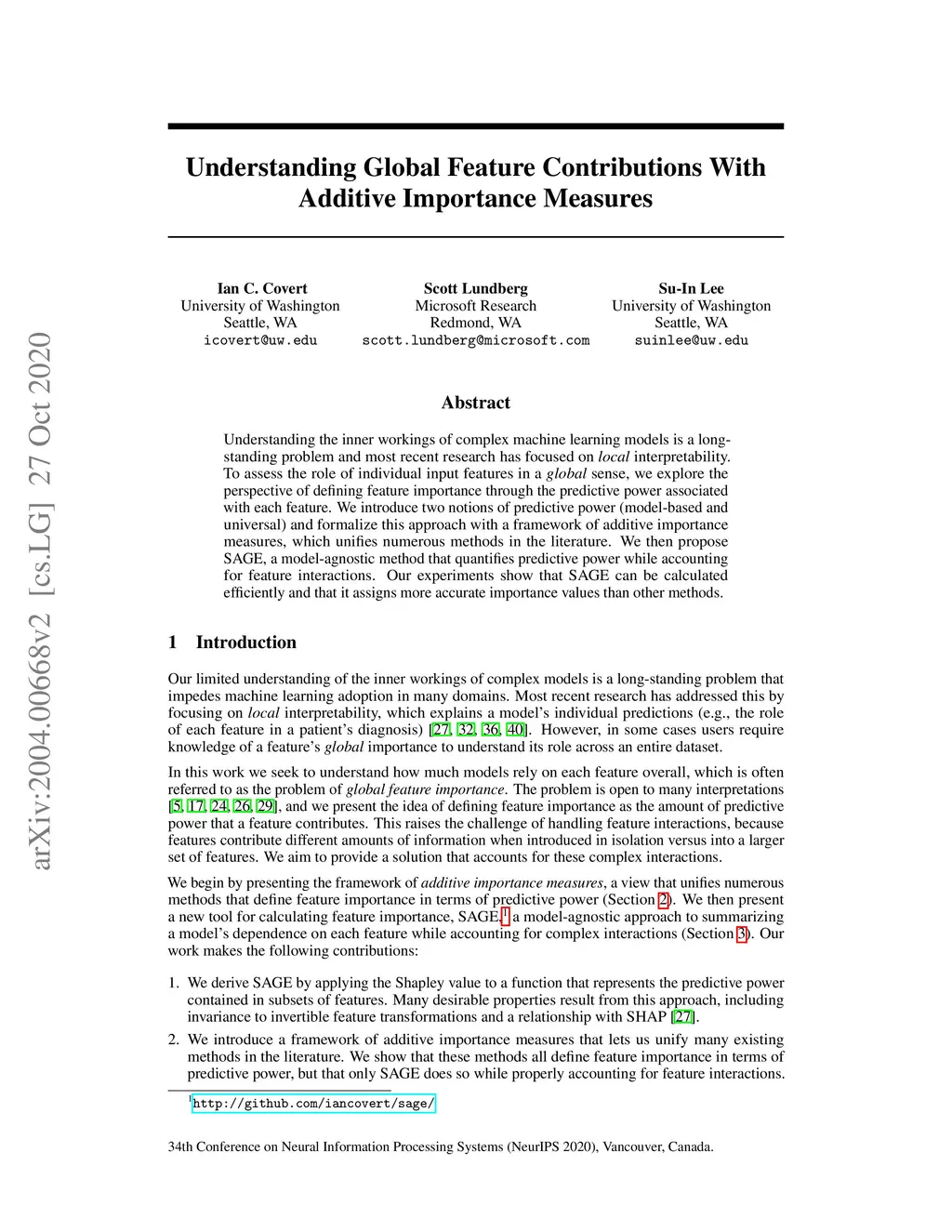 Understanding the inner workings of complex machine learning models is a long-standing problem and most recent research has focused on local interpretability. To assess the role of individual input features in a global sense, we explore the perspective of defining feature importance through the predictive power associated with each feature. We introduce two notions of predictive power (model-based and universal) and formalize this approach with a framework of additive importance measures, which unifies numerous methods in the literature. We then propose SAGE, a model-agnostic method that quantifies predictive power while accounting for feature interactions. Our experiments show that SAGE can be calculated efficiently and that it assigns more accurate importance values than other methods.