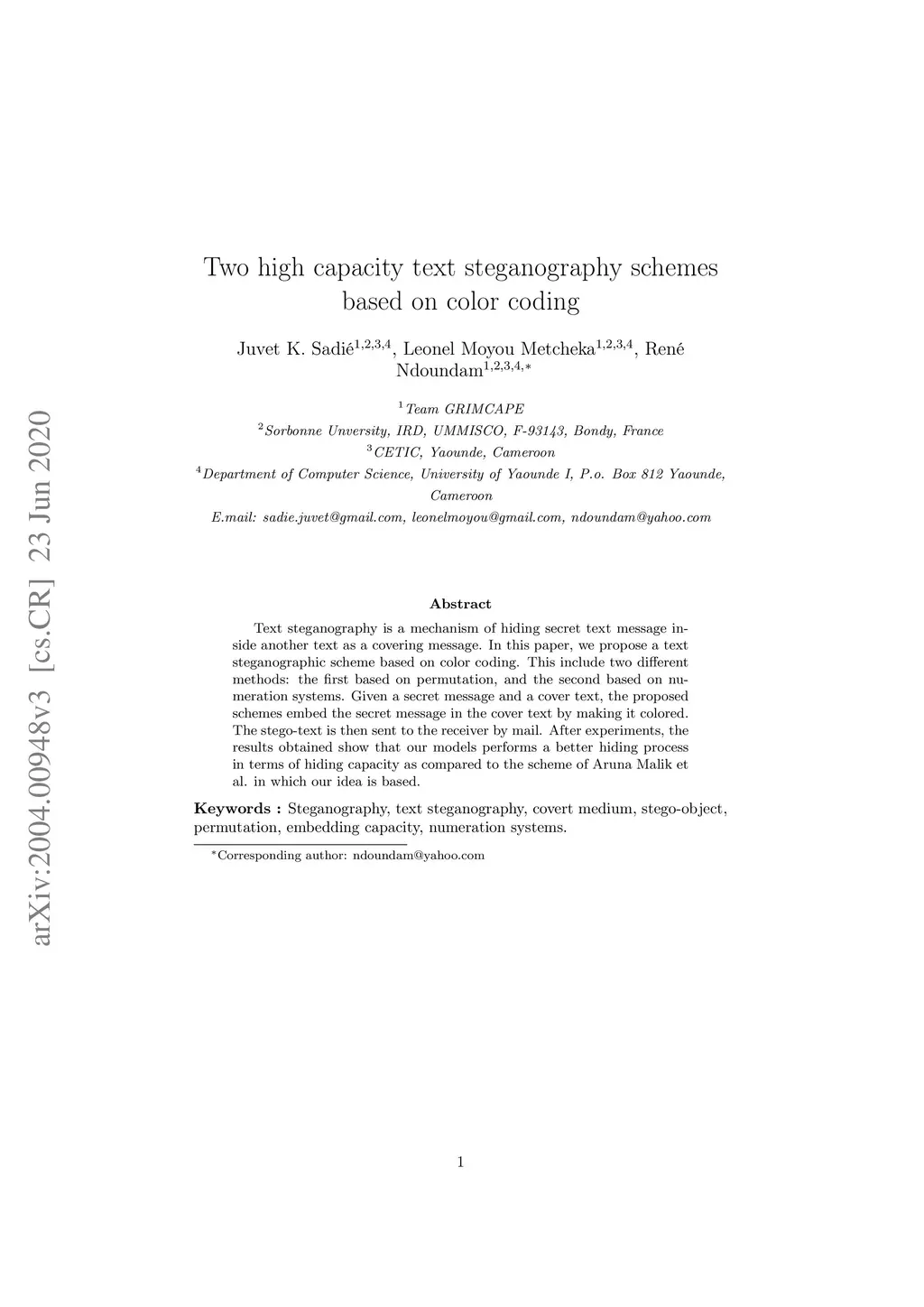 Text steganography is a mechanism of hiding secret text message inside another text as a covering message. In this paper, we propose a text steganographic scheme based on color coding. This include two different methods: the first based on permutation, and the second based on numeration systems. Given a secret message and a cover text, the proposed schemes embed the secret message in the cover text by making it colored. The stego-text is then sent to the receiver by mail. After experiments, the results obtained show that our models performs a better hiding process in terms of hiding capacity as compared to the scheme of Aruna Malik et al. in which our idea is based.