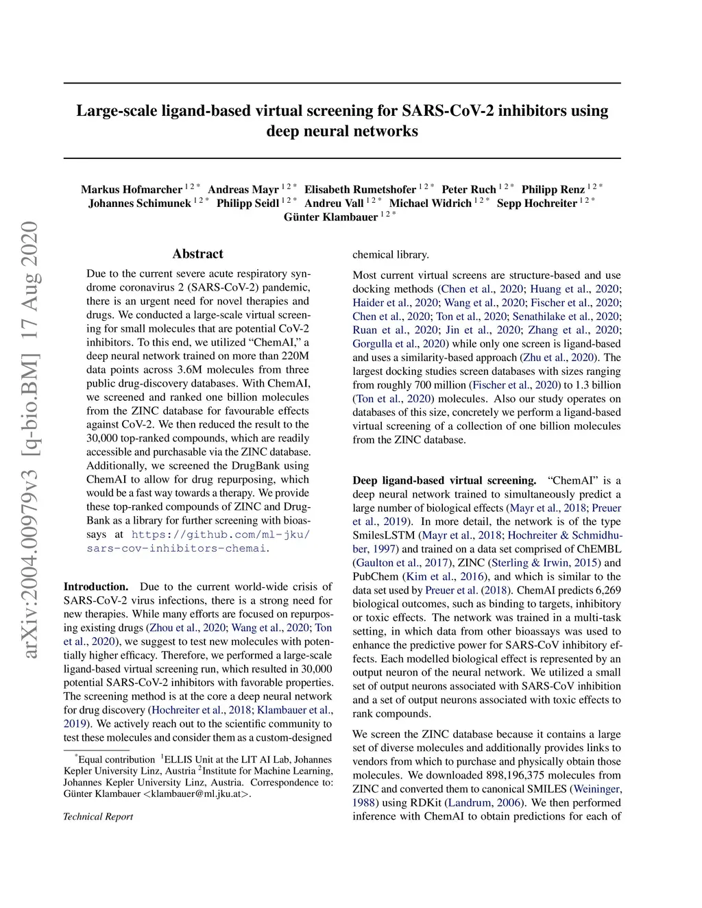 Due to the current severe acute respiratory syndrome coronavirus 2 (SARS-CoV-2) pandemic, there is an urgent need for novel therapies and drugs. We conducted a large-scale virtual screening for small molecules that are potential CoV-2 inhibitors. To this end, we utilized "ChemAI", a deep neural network trained on more than 220M data points across 3.6M molecules from three public drug-discovery databases. With ChemAI, we screened and ranked one billion molecules from the ZINC database for favourable effects against CoV-2. We then reduced the result to the 30,000 top-ranked compounds, which are readily accessible and purchasable via the ZINC database. Additionally, we screened the DrugBank using ChemAI to allow for drug repurposing, which would be a fast way towards a therapy. We provide these top-ranked compounds of ZINC and DrugBank as a library for further screening with bioassays at https://github.com/ml-jku/sars-cov-inhibitors-chemai.
