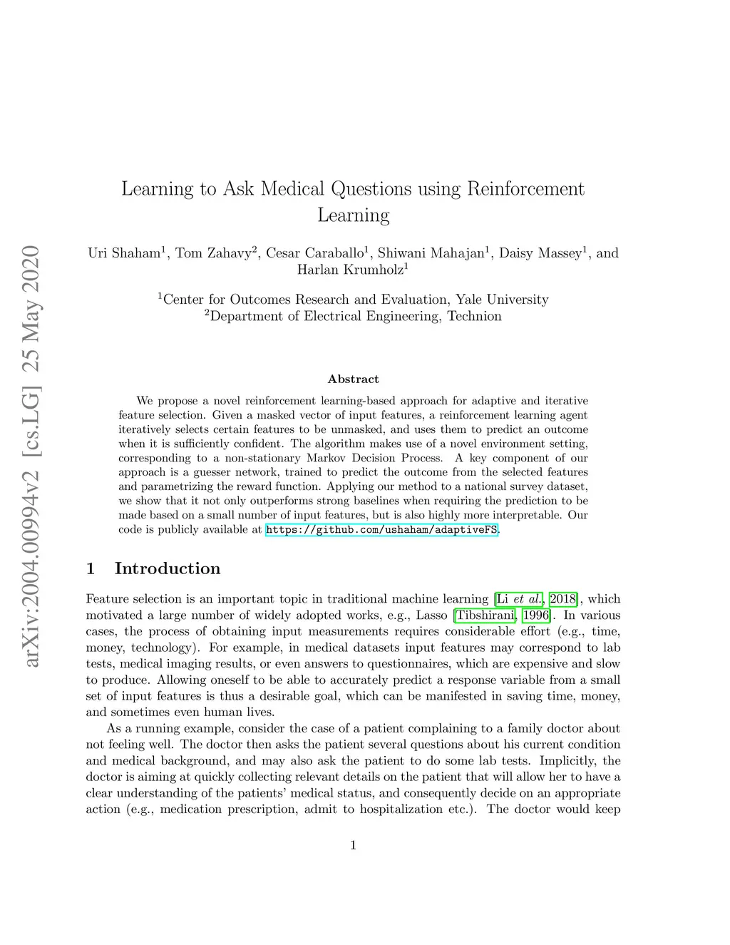 We propose a novel reinforcement learning-based approach for adaptive and iterative feature selection. Given a masked vector of input features, a reinforcement learning agent iteratively selects certain features to be unmasked, and uses them to predict an outcome when it is sufficiently confident. The algorithm makes use of a novel environment setting, corresponding to a non-stationary Markov Decision Process. A key component of our approach is a guesser network, trained to predict the outcome from the selected features and parametrizing the reward function. Applying our method to a national survey dataset, we show that it not only outperforms strong baselines when requiring the prediction to be made based on a small number of input features, but is also highly more interpretable. Our code is publicly available at \url{https://github.com/ushaham/adaptiveFS}.