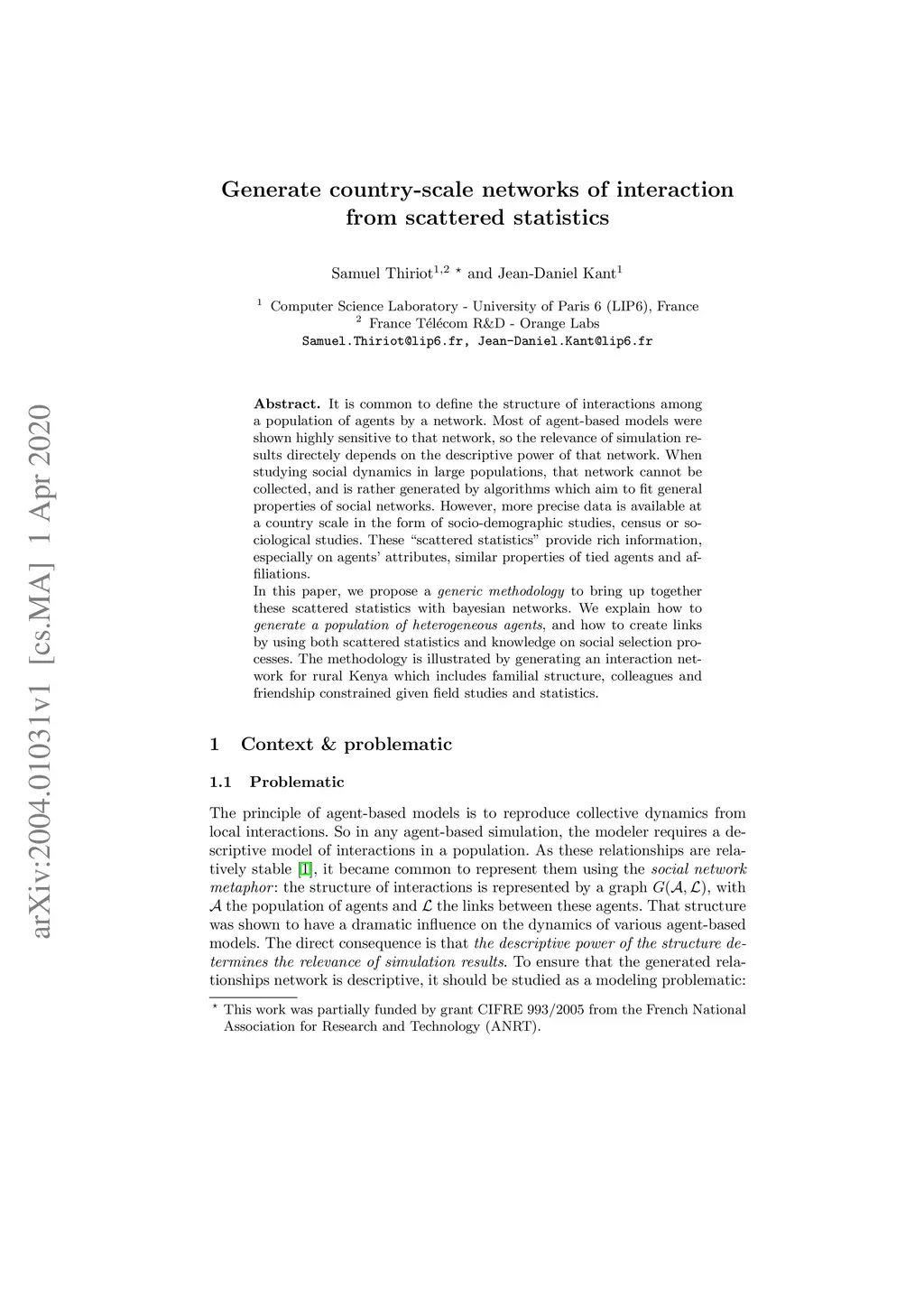 It is common to define the structure of interactions among a population of agents by a network. Most of agent-based models were shown highly sensitive to that network, so the relevance of simulation results directely depends on the descriptive power of that network. When studying social dynamics in large populations, that network cannot be collected, and is rather generated by algorithms which aim to fit general properties of social networks. However, more precise data is available at a country scale in the form of socio-demographic studies, census or sociological studies. These "scattered statistics" provide rich information, especially on agents' attributes, similar properties of tied agents and affiliations. In this paper, we propose a generic methodology to bring up together these scattered statistics with bayesian networks. We explain how to generate a population of heterogeneous agents, and how to create links by using both scattered statistics and knowledge on social selection processes. The methodology is illustrated by generating an interaction network for rural Kenya which includes familial structure, colleagues and friendship constrained given field studies and statistics.