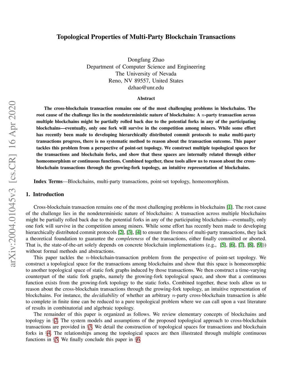 The cross-blockchain transaction remains one of the most challenging problems in blockchains. The root cause of the challenge lies in the nondeterministic nature of blockchains: A transaction across multiple blockchains might be partially rolled back due to the potential forks in any of the participating blockchains---eventually, only one fork will survive in the competition among miners. While some effort has recently been made to developing hierarchically distributed commit protocols to make multi-party transactions progress, there is no systematic method to reason about the transaction results. This paper tackles this problem from a perspective of point-set topology. We construct multiple topology spaces for the transactions and blockchain forks, and show that these spaces are internally related through either homeomorphism or continuous functions. Combined together, these tools allow us to reason about the cross-blockchain transactions through the growing-fork topology, an intuitive representation of blockchains. As of writing, this paper is the first study on point-set topological properties of blockchains.