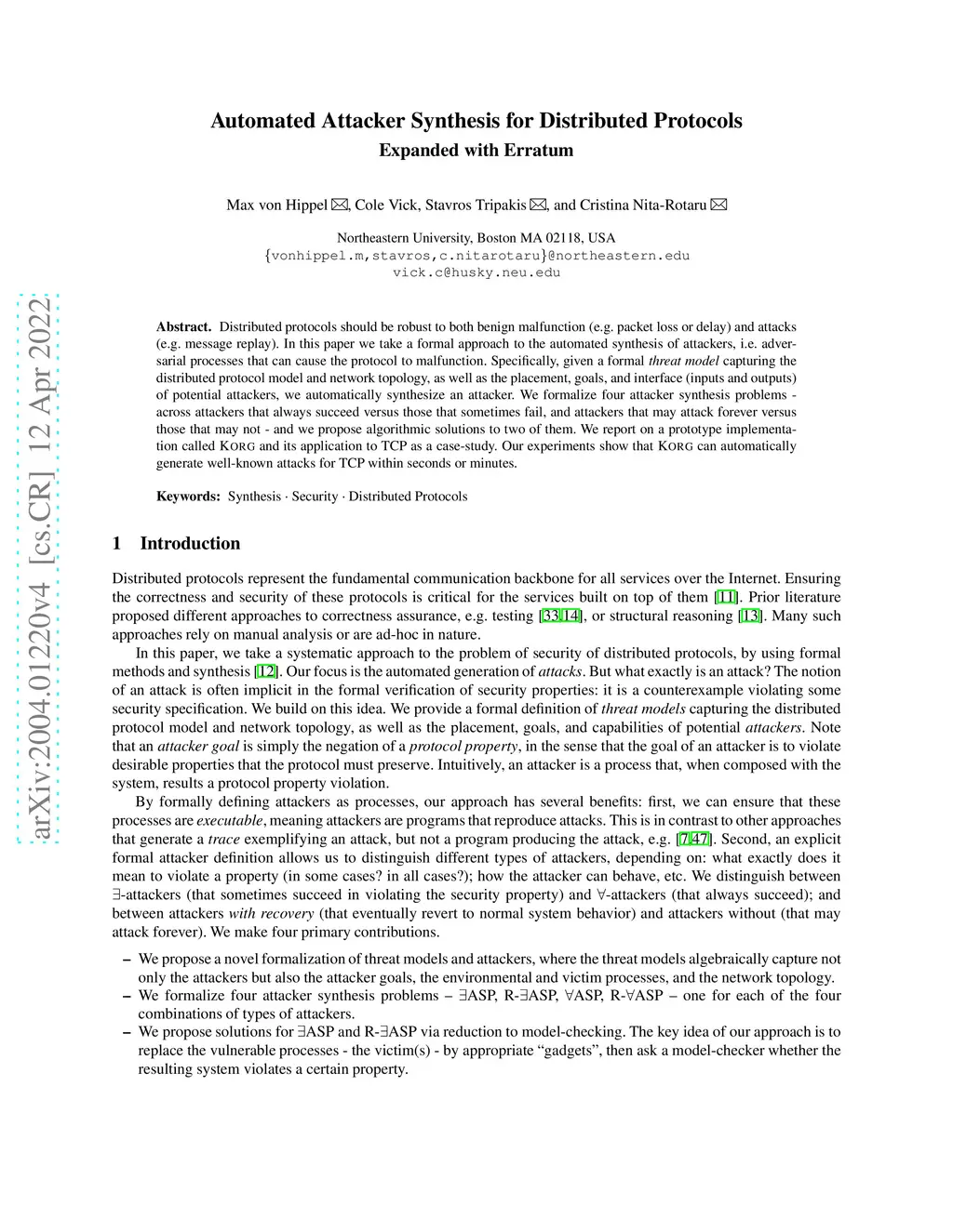 Distributed protocols should be robust to both benign malfunction (e.g. packet loss or delay) and attacks (e.g. message replay) from internal or external adversaries. In this paper we take a formal approach to the automated synthesis of attackers, i.e. adversarial processes that can cause the protocol to malfunction. Specifically, given a formal threat model capturing the distributed protocol model and network topology, as well as the placement, goals, and interface (inputs and outputs) of potential attackers, we automatically synthesize an attacker. We formalize four attacker synthesis problems - across attackers that always succeed versus those that sometimes fail, and attackers that attack forever versus those that do not - and we propose algorithmic solutions to two of them. We report on a prototype implementation called KORG and its application to TCP as a case-study. Our experiments show that KORG can automatically generate well-known attacks for TCP within seconds or minutes.