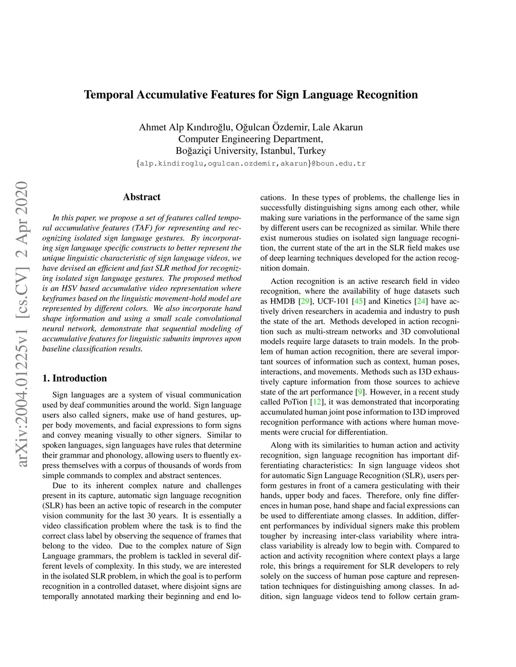 In this paper, we propose a set of features called temporal accumulative features (TAF) for representing and recognizing isolated sign language gestures. By incorporating sign language specific constructs to better represent the unique linguistic characteristic of sign language videos, we have devised an efficient and fast SLR method for recognizing isolated sign language gestures. The proposed method is an HSV based accumulative video representation where keyframes based on the linguistic movement-hold model are represented by different colors. We also incorporate hand shape information and using a small scale convolutional neural network, demonstrate that sequential modeling of accumulative features for linguistic subunits improves upon baseline classification results.