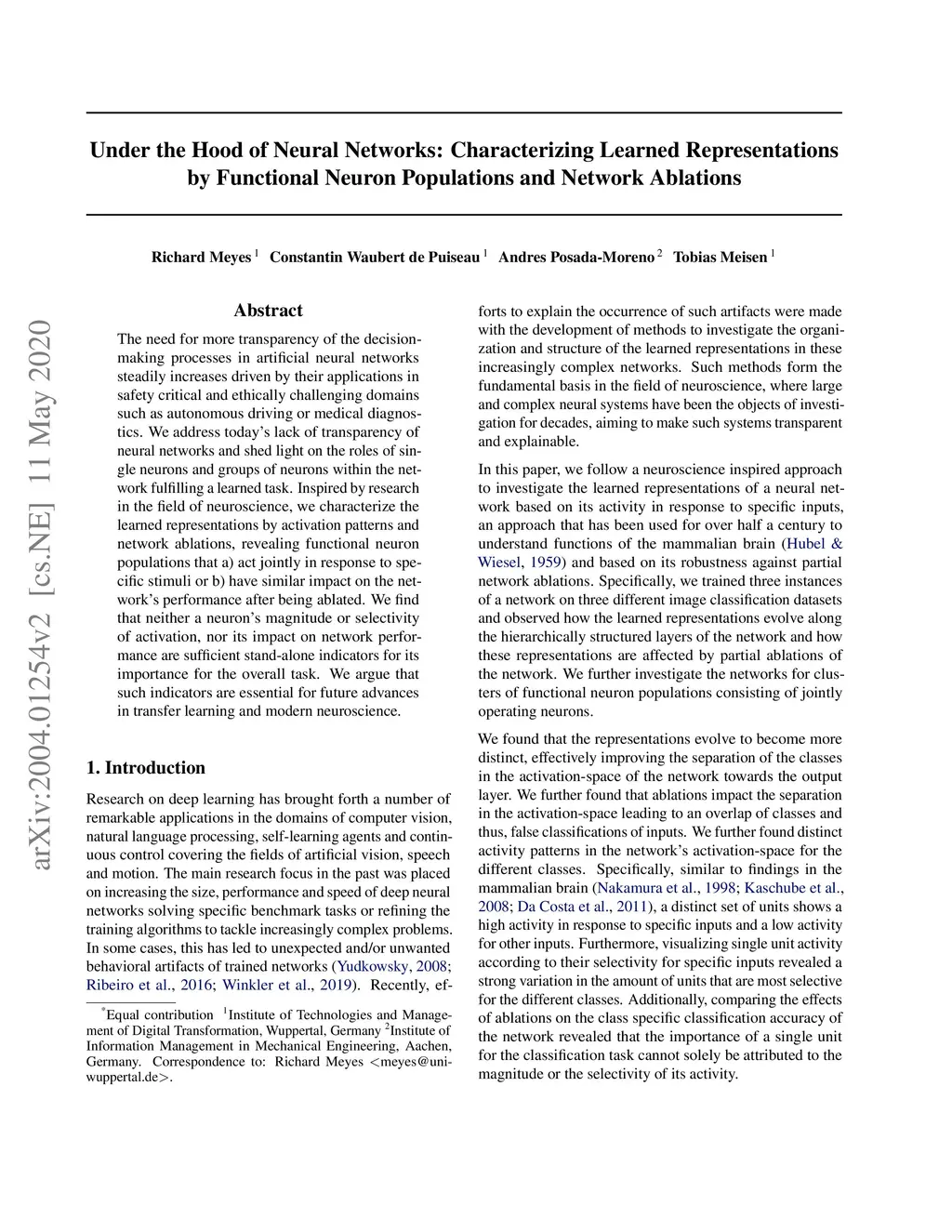 The need for more transparency of the decision-making processes in artificial neural networks steadily increases driven by their applications in safety critical and ethically challenging domains such as autonomous driving or medical diagnostics. We address today's lack of transparency of neural networks and shed light on the roles of single neurons and groups of neurons within the network fulfilling a learned task. Inspired by research in the field of neuroscience, we characterize the learned representations by activation patterns and network ablations, revealing functional neuron populations that a) act jointly in response to specific stimuli or b) have similar impact on the network's performance after being ablated. We find that neither a neuron's magnitude or selectivity of activation, nor its impact on network performance are sufficient stand-alone indicators for its importance for the overall task. We argue that such indicators are essential for future advances in transfer learning and modern neuroscience.