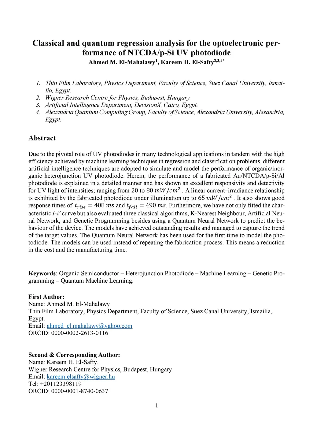 Due to the pivotal role of UV photodiodes in many technological applications in tandem with the high efficiency achieved by machine learning techniques in regression and classification problems, different artificial intelligence techniques are adopted model the performance of organic/inorganic heterojunction UV photodiode. Herein, the performance of a fabricated Au/NTCDA/p-Si/Al photodiode was explained in details and showed an excellent responsivity, and detectivity for UV light of intensities ranges from 20 to 80 . The fabricated photodiodes exhibited a linear current-irradiance relationship under illumination up to 65 . It also exhibits good response times of ms and ms. Furthermore, we have not only fitted the characteristic I-V curve but also evaluated three classical algorithms; k-nearest neighbour, artificial neural network, and genetic programming besides using a quantum neural network to predict the behaviour of the fabricated device. The models have achieved outstanding results and managed to capture the trend of the target values. The Quantum Neural Network has been used for the first time to model the photodiode. The models can be used instead of repeating the fabrication process. This means a reduction in cost and manufacturing time.