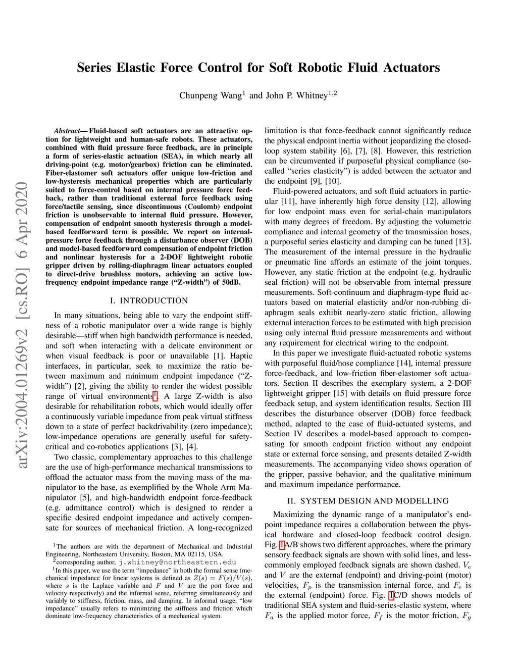 Fluid-based soft actuators are an attractive option for lightweight and human-safe robots. These actuators, combined with fluid pressure force feedback, are in principle a form of series-elastic actuation (SEA), in which nearly all driving-point (e.g. motor/gearbox) friction can be eliminated. Fiber-elastomer soft actuators offer unique low-friction and low-hysteresis mechanical properties which are particularly suited to force-control based on internal pressure force feedback, rather than traditional external force feedback using force/tactile sensing, since discontinuous (Coulomb) endpoint friction is unobservable to internal fluid pressure. However, compensation of endpoint smooth hysteresis through a model-based feedforward term is possible. We report on internal-pressure force feedback through a disturbance observer (DOB) and model-based feedforward compensation of endpoint friction and nonlinear hysteresis for a 2-DOF lightweight robotic gripper driven by rolling-diaphragm linear actuators coupled to direct-drive brushless motors, achieving an active low-frequency endpoint impedance range ("Z-width") of 50dB.