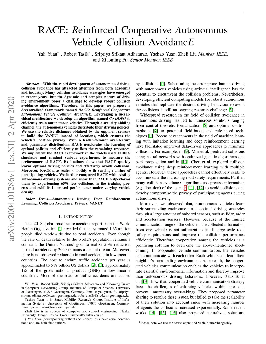 RACE: Reinforced Cooperative Autonomous Vehicle Collision AvoidancE