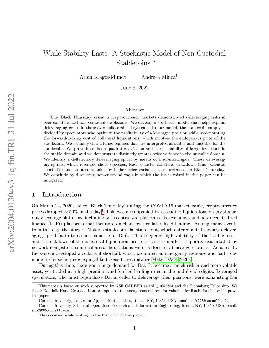 The `Black Thursday' crisis in cryptocurrency markets demonstrated deleveraging risks in over-collateralized lending and stablecoins. We develop a stochastic model of over-collateralized stablecoins that helps explain such crises. In our model, the stablecoin supply is decided by speculators who optimize the profitability of a leveraged position while incorporating the forward-looking cost of collateral liquidations, which involves the endogenous price of the stablecoin. We formally characterize regimes that are interpreted as stable and unstable for the stablecoin. We prove bounds on the probabilities of large deviations and quadratic variation in the stable domain and distinctly greater price variance in the unstable domain. The unstable domain can be triggered by large deviations, collapsed expectations, or liquidity problems from deleveraging. We formally characterize a deflationary deleveraging spiral as a submartingale that can cause the system to behave in counterintuitive ways due to liquidity problems in a crisis. These deleveraging spirals, which resemble short squeezes, lead to faster collateral drawdown (and potential shortfalls) and are accompanied by higher price variance, as experienced on Black Thursday. We also demonstrate `perfect' stability results in idealized settings and discuss mechanisms which could bring realistic settings closer to such idealized stable settings.