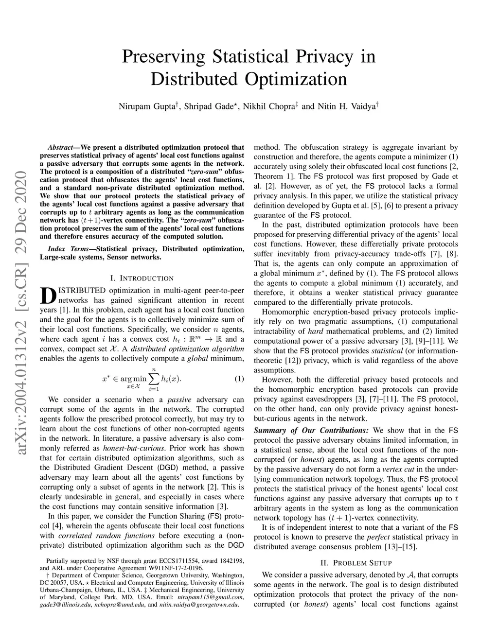 We present a distributed optimization protocol that preserves statistical privacy of agents' local cost functions against a passive adversary that corrupts some agents in the network. The protocol is a composition of a distributed ``{\em zero-sum}" obfuscation protocol that obfuscates the agents' local cost functions, and a standard non-private distributed optimization method. We show that our protocol protects the statistical privacy of the agents' local cost functions against a passive adversary that corrupts up to arbitrary agents as long as the communication network has -vertex connectivity. The ``{\em zero-sum}" obfuscation protocol preserves the sum of the agents' local cost functions and therefore ensures accuracy of the computed solution.