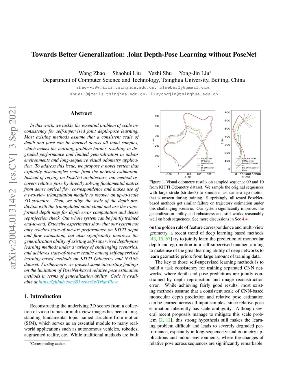In this work, we tackle the essential problem of scale inconsistency for self-supervised joint depth-pose learning. Most existing methods assume that a consistent scale of depth and pose can be learned across all input samples, which makes the learning problem harder, resulting in degraded performance and limited generalization in indoor environments and long-sequence visual odometry application. To address this issue, we propose a novel system that explicitly disentangles scale from the network estimation. Instead of relying on PoseNet architecture, our method recovers relative pose by directly solving fundamental matrix from dense optical flow correspondence and makes use of a two-view triangulation module to recover an up-to-scale 3D structure. Then, we align the scale of the depth prediction with the triangulated point cloud and use the transformed depth map for depth error computation and dense reprojection check. Our whole system can be jointly trained end-to-end. Extensive experiments show that our system not only reaches state-of-the-art performance on KITTI depth and flow estimation, but also significantly improves the generalization ability of existing self-supervised depth-pose learning methods under a variety of challenging scenarios, and achieves state-of-the-art results among self-supervised learning-based methods on KITTI Odometry and NYUv2 dataset. Furthermore, we present some interesting findings on the limitation of PoseNet-based relative pose estimation methods in terms of generalization ability. Code is available at https://github.com/B1ueber2y/TrianFlow.