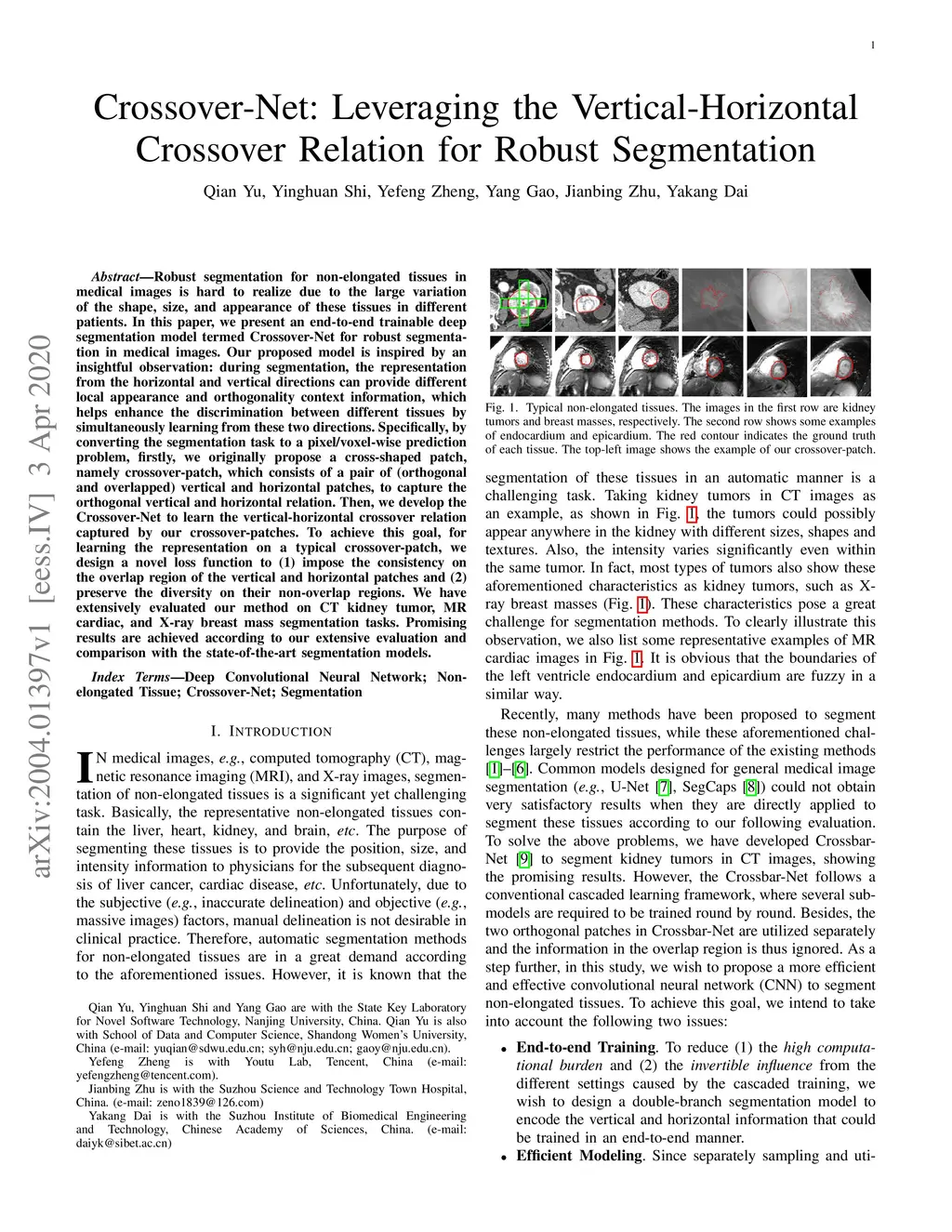 Robust segmentation for non-elongated tissues in medical images is hard to realize due to the large variation of the shape, size, and appearance of these tissues in different patients. In this paper, we present an end-to-end trainable deep segmentation model termed Crossover-Net for robust segmentation in medical images. Our proposed model is inspired by an insightful observation: during segmentation, the representation from the horizontal and vertical directions can provide different local appearance and orthogonality context information, which helps enhance the discrimination between different tissues by simultaneously learning from these two directions. Specifically, by converting the segmentation task to a pixel/voxel-wise prediction problem, firstly, we originally propose a cross-shaped patch, namely crossover-patch, which consists of a pair of (orthogonal and overlapped) vertical and horizontal patches, to capture the orthogonal vertical and horizontal relation. Then, we develop the Crossover-Net to learn the vertical-horizontal crossover relation captured by our crossover-patches. To achieve this goal, for learning the representation on a typical crossover-patch, we design a novel loss function to (1) impose the consistency on the overlap region of the vertical and horizontal patches and (2) preserve the diversity on their non-overlap regions. We have extensively evaluated our method on CT kidney tumor, MR cardiac, and X-ray breast mass segmentation tasks. Promising results are achieved according to our extensive evaluation and comparison with the state-of-the-art segmentation models.
