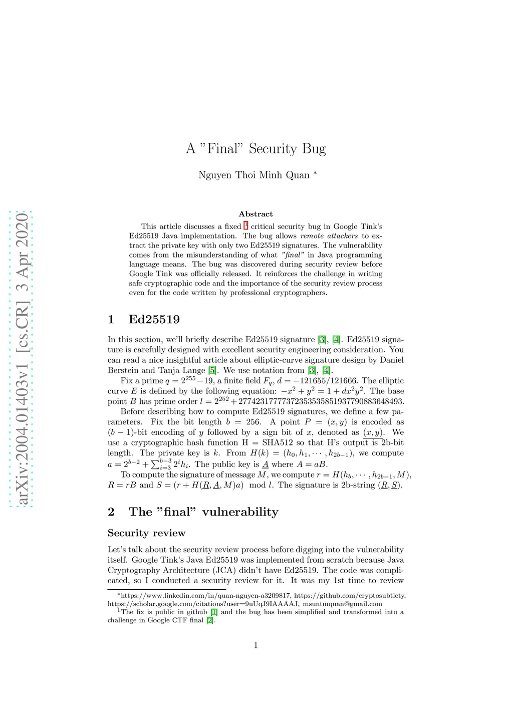 This article discusses a fixed critical security bug in Google Tink's Ed25519 Java implementation. The bug allows remote attackers to extract the private key with only two Ed25519 signatures. The vulnerability comes from the misunderstanding of what "final" in Java programming language means. The bug was discovered during security review before Google Tink was officially released. It reinforces the challenge in writing safe cryptographic code and the importance of the security review process even for the code written by professional cryptographers.