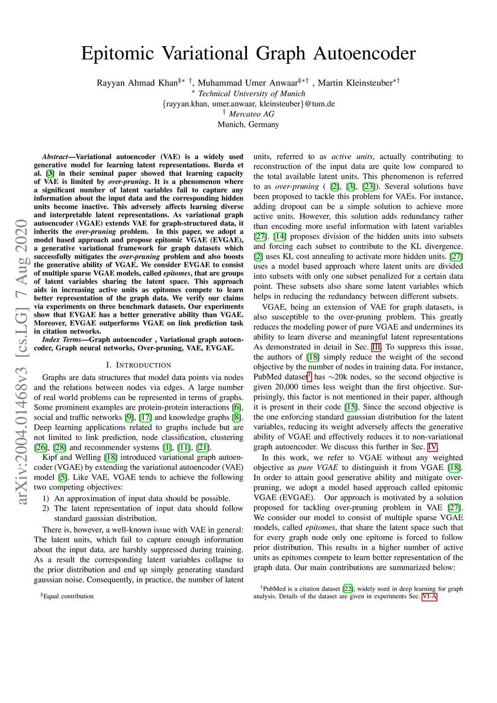 Variational autoencoder (VAE) is a widely used generative model for learning latent representations. Burda et al. in their seminal paper showed that learning capacity of VAE is limited by over-pruning. It is a phenomenon where a significant number of latent variables fail to capture any information about the input data and the corresponding hidden units become inactive. This adversely affects learning diverse and interpretable latent representations. As variational graph autoencoder (VGAE) extends VAE for graph-structured data, it inherits the over-pruning problem. In this paper, we adopt a model based approach and propose epitomic VGAE (EVGAE),a generative variational framework for graph datasets which successfully mitigates the over-pruning problem and also boosts the generative ability of VGAE. We consider EVGAE to consist of multiple sparse VGAE models, called epitomes, that are groups of latent variables sharing the latent space. This approach aids in increasing active units as epitomes compete to learn better representation of the graph data. We verify our claims via experiments on three benchmark datasets. Our experiments show that EVGAE has a better generative ability than VGAE. Moreover, EVGAE outperforms VGAE on link prediction task in citation networks.