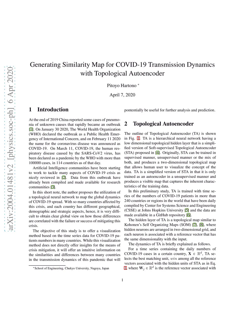 At the beginning of 2020 the world has seen the initial outbreak of COVID-19, a disease caused by SARS-CoV2 virus in China. The World Health Organization (WHO) declared this disease as a pandemic on March 11 2020. As the disease spread globally, it becomes difficult to tract the transmission dynamics of this disease in all countries, as they may differ in geographical, demographic and strategical aspects. In this short note, the author proposes the utilization of a type of neural network to generate a global topological map for these dynamics, in which countries that share similar dynamics are mapped adjacently, while countries with significantly different dynamics are mapped far from each other. The author believes that this kind of topological map can be useful for further analyzing and comparing the correlation between the diseases dynamics with strategies to mitigate this global crisis in an intuitive manner. Some initial experiments with with time series of patients numbers in more than 240 countries are explained in this note.