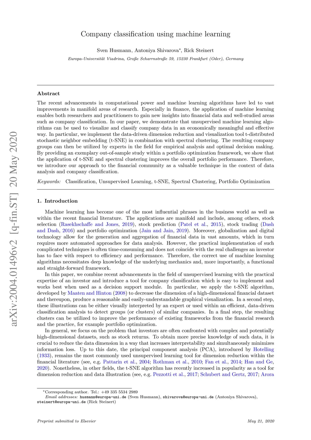 The recent advancements in computational power and machine learning algorithms have led to vast improvements in manifold areas of research. Especially in finance, the application of machine learning enables both researchers and practitioners to gain new insights into financial data and well-studied areas such as company classification. In our paper, we demonstrate that unsupervised machine learning algorithms can be used to visualize and classify company data in an economically meaningful and effective way. In particular, we implement the data-driven dimension reduction and visualization tool t-distributed stochastic neighbor embedding (t-SNE) in combination with spectral clustering. The resulting company groups can then be utilized by experts in the field for empirical analysis and optimal decision making. By providing an exemplary out-of-sample study within a portfolio optimization framework, we show that the application of t-SNE and spectral clustering improves the overall portfolio performance. Therefore, we introduce our approach to the financial community as a valuable technique in the context of data analysis and company classification.