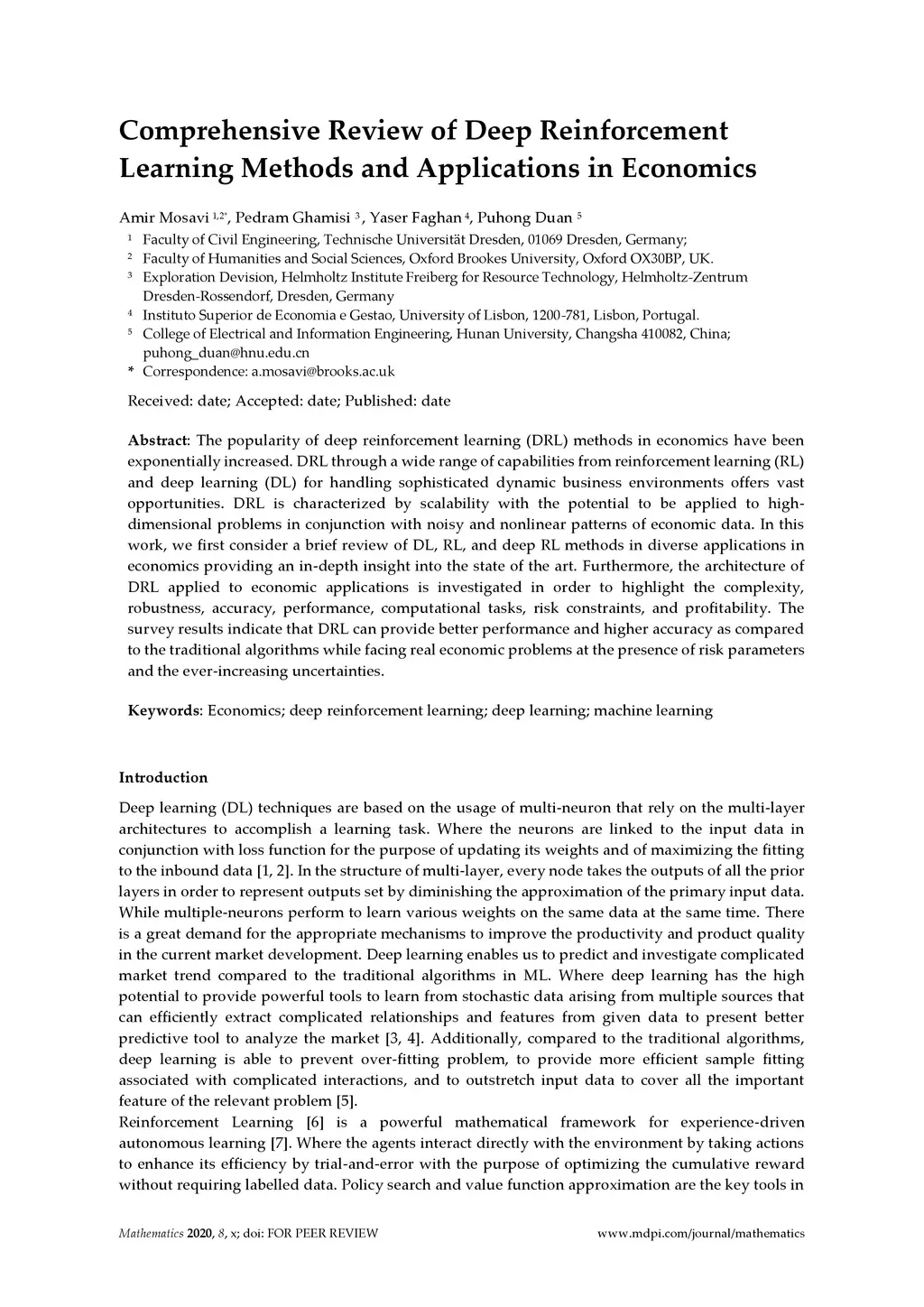The popularity of deep reinforcement learning (DRL) methods in economics have been exponentially increased. DRL through a wide range of capabilities from reinforcement learning (RL) and deep learning (DL) for handling sophisticated dynamic business environments offers vast opportunities. DRL is characterized by scalability with the potential to be applied to high-dimensional problems in conjunction with noisy and nonlinear patterns of economic data. In this work, we first consider a brief review of DL, RL, and deep RL methods in diverse applications in economics providing an in-depth insight into the state of the art. Furthermore, the architecture of DRL applied to economic applications is investigated in order to highlight the complexity, robustness, accuracy, performance, computational tasks, risk constraints, and profitability. The survey results indicate that DRL can provide better performance and higher accuracy as compared to the traditional algorithms while facing real economic problems at the presence of risk parameters and the ever-increasing uncertainties.
