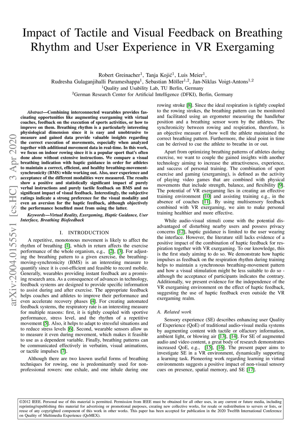 Combining interconnected wearables provides fascinating opportunities like augmenting exergaming with virtual coaches, feedback on the execution of sports activities, or how to improve on them. Breathing rhythm is a particularly interesting physiological dimension since it is easy and unobtrusive to measure and gained data provide valuable insights regarding the correct execution of movements, especially when analyzed together with additional movement data in real-time. In this work, we focus on indoor rowing since it is a popular sport that's often done alone without extensive instructions. We compare a visual breathing indication with haptic guidance in order for athletes to maintain a correct, efficient, and healthy breathing-movement-synchronicity (BMS) while working out. Also, user experience and acceptance of the different modalities were measured. The results show a positive and statistically significant impact of purely verbal instructions and purely tactile feedback on BMS and no significant impact of visual feedback. Interestingly, the subjective ratings indicate a strong preference for the visual modality and even an aversion for the haptic feedback, although objectively the performance benefited most from using the latter.