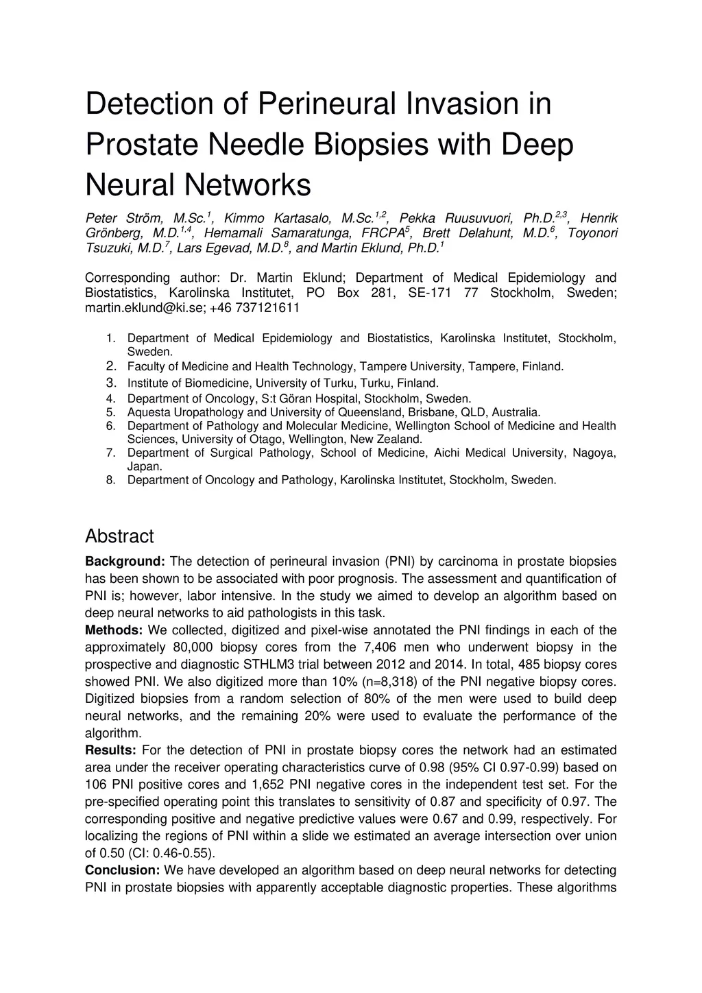Background: The detection of perineural invasion (PNI) by carcinoma in prostate biopsies has been shown to be associated with poor prognosis. The assessment and quantification of PNI is; however, labor intensive. In the study we aimed to develop an algorithm based on deep neural networks to aid pathologists in this task. Methods: We collected, digitized and pixel-wise annotated the PNI findings in each of the approximately 80,000 biopsy cores from the 7,406 men who underwent biopsy in the prospective and diagnostic STHLM3 trial between 2012 and 2014. In total, 485 biopsy cores showed PNI. We also digitized more than 10% (n=8,318) of the PNI negative biopsy cores. Digitized biopsies from a random selection of 80% of the men were used to build deep neural networks, and the remaining 20% were used to evaluate the performance of the algorithm. Results: For the detection of PNI in prostate biopsy cores the network had an estimated area under the receiver operating characteristics curve of 0.98 (95% CI 0.97-0.99) based on 106 PNI positive cores and 1,652 PNI negative cores in the independent test set. For the pre-specified operating point this translates to sensitivity of 0.87 and specificity of 0.97. The corresponding positive and negative predictive values were 0.67 and 0.99, respectively. For localizing the regions of PNI within a slide we estimated an average intersection over union of 0.50 (CI: 0.46-0.55). Conclusion: We have developed an algorithm based on deep neural networks for detecting PNI in prostate biopsies with apparently acceptable diagnostic properties. These algorithms have the potential to aid pathologists in the day-to-day work by drastically reducing the number of biopsy cores that need to be assessed for PNI and by highlighting regions of diagnostic interest.