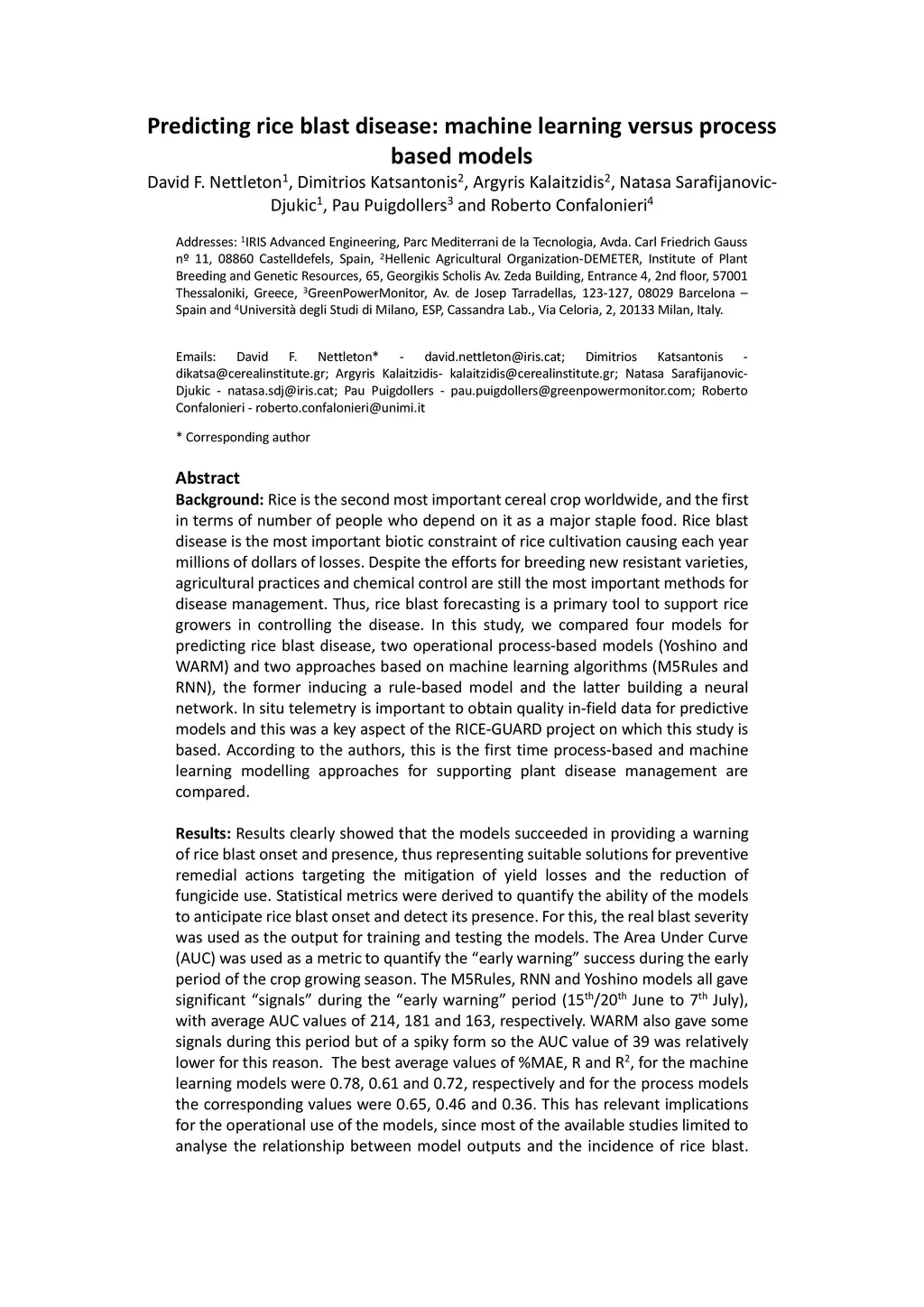 Rice is the second most important cereal crop worldwide, and the first in terms of number of people who depend on it as a major staple food. Rice blast disease is the most important biotic constraint of rice cultivation causing each year millions of dollars of losses. Despite the efforts for breeding new resistant varieties, agricultural practices and chemical control are still the most important methods for disease management. Thus, rice blast forecasting is a primary tool to support rice growers in controlling the disease. In this study, we compared four models for predicting rice blast disease, two operational process-based models (Yoshino and WARM) and two approaches based on machine learning algorithms (M5Rules and RNN), the former inducing a rule-based model and the latter building a neural network. In situ telemetry is important to obtain quality in-field data for predictive models and this was a key aspect of the RICE-GUARD project on which this study is based. According to the authors, this is the first time process-based and machine learning modelling approaches for supporting plant disease management are compared.