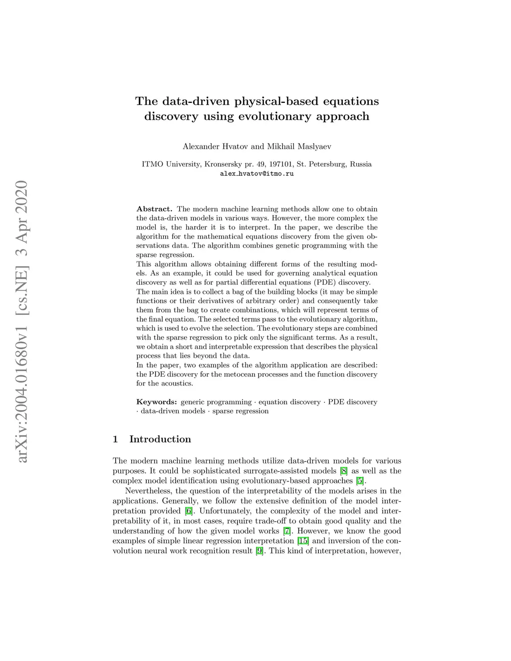 The modern machine learning methods allow one to obtain the data-driven models in various ways. However, the more complex the model is, the harder it is to interpret. In the paper, we describe the algorithm for the mathematical equations discovery from the given observations data. The algorithm combines genetic programming with the sparse regression. This algorithm allows obtaining different forms of the resulting models. As an example, it could be used for governing analytical equation discovery as well as for partial differential equations (PDE) discovery. The main idea is to collect a bag of the building blocks (it may be simple functions or their derivatives of arbitrary order) and consequently take them from the bag to create combinations, which will represent terms of the final equation. The selected terms pass to the evolutionary algorithm, which is used to evolve the selection. The evolutionary steps are combined with the sparse regression to pick only the significant terms. As a result, we obtain a short and interpretable expression that describes the physical process that lies beyond the data. In the paper, two examples of the algorithm application are described: the PDE discovery for the metocean processes and the function discovery for the acoustics.