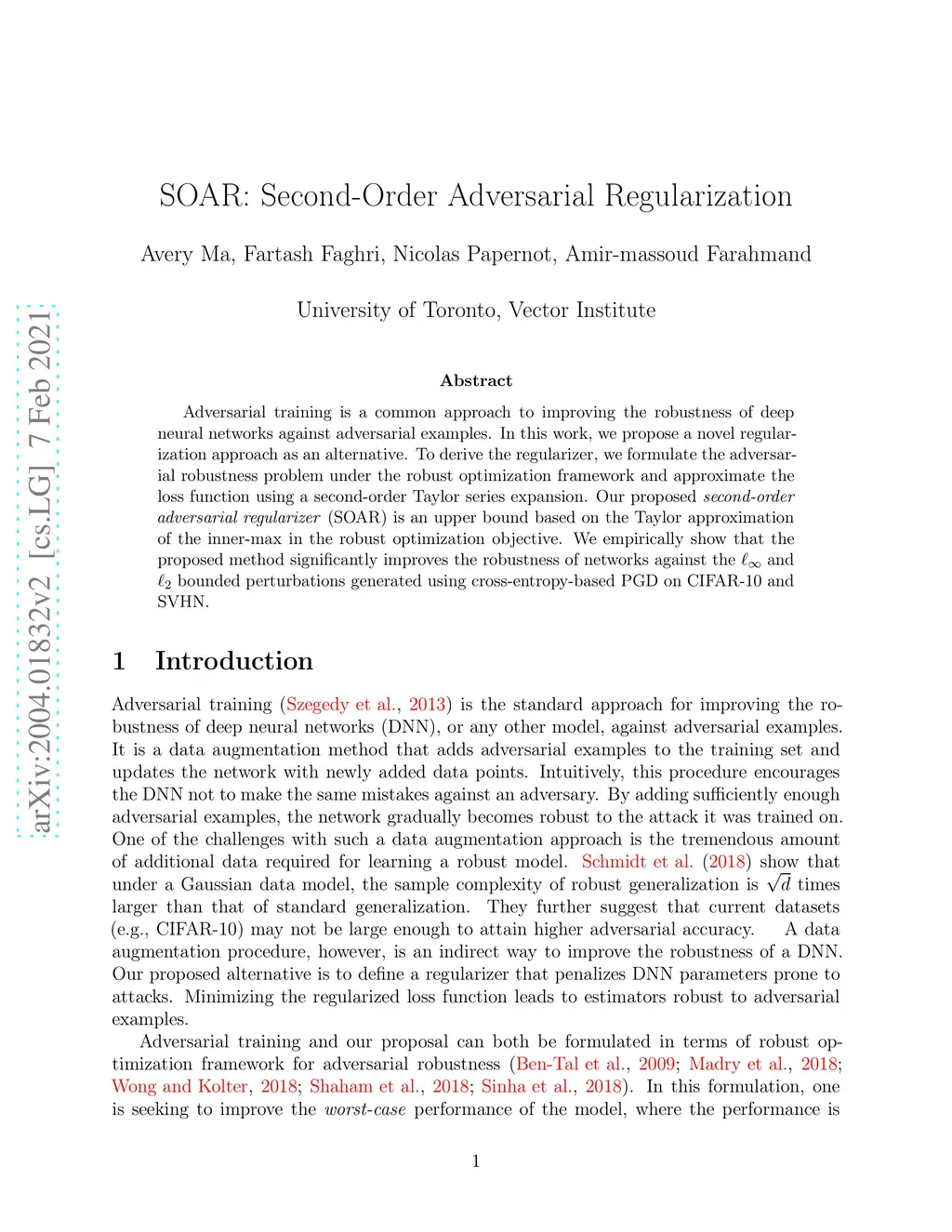 Adversarial training is a common approach to improving the robustness of deep neural networks against adversarial examples. In this work, we propose a novel regularization approach as an alternative. To derive the regularizer, we formulate the adversarial robustness problem under the robust optimization framework and approximate the loss function using a second-order Taylor series expansion. Our proposed second-order adversarial regularizer (SOAR) is an upper bound based on the Taylor approximation of the inner-max in the robust optimization objective. We empirically show that the proposed method significantly improves the robustness of networks against the and bounded perturbations generated using cross-entropy-based PGD on CIFAR-10 and SVHN.